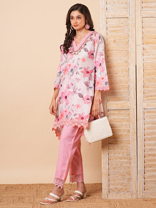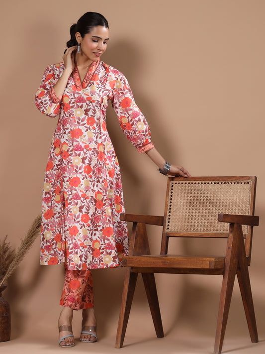 Floral Printed A-Line Paneled Kurta with Pant...