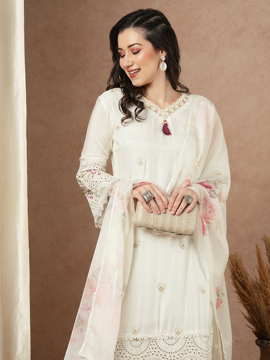 Floral Printed & Embroidered Straight Kurta with...
