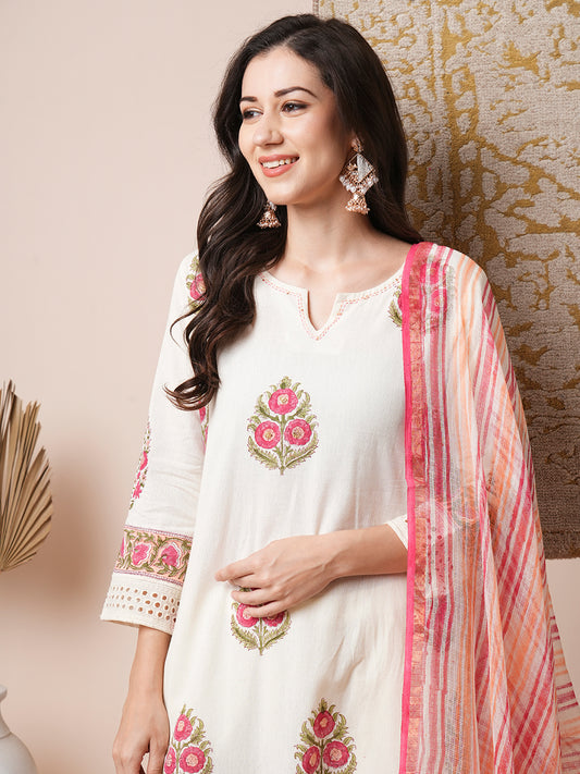 MRP (Inclusive of all taxes)Regular price ₹ 3,199.00₹ 3,199.00 Regular priceUnit price / per₹ 7,999.00Sale priceM L XL 2XL add to cartSale{"id":7390848352342,"title":"Floral Block Printed \u0026 Embroidered A-Line Kurta with Pant \u0026 Dupatta - Off White","handle":"floral-block-printed-embroidered-a-line-kurta-with-pant-dupatta-off-white","description":"\u003ch1\u003eHighlights\u003c\/h1\u003e\n\u003cp\u003e\u003cbr\u003e-A-Line Kurta \u003cbr\u003e-Floral Block Prints all over\u003cbr\u003e-Comes with Stripes Printed Dupatta\u003c\/p\u003e\n\u003ch1\u003eFabric \u0026amp; Colour\u003c\/h1\u003e\n\u003cp\u003e\u003cbr\u003eTop Colour: Off White\u003cbr\u003eTop Fabric: Cotton\u003cbr\u003eBottom Colour: Off White\u003cbr\u003eBottom Fabric: Cotton Blend\u003cbr\u003eDupatta Colour: Multi\u003cbr\u003eDupatta Fabric: Supernet\u003c\/p\u003e\n\u003ch1\u003eSpecifications\u003c\/h1\u003e\n\u003cp\u003e\u003cbr\u003eTop Design: Floral print, Ethnic print\u003cbr\u003eTop Craft: Embroidery, Plain and Prints\u003cbr\u003eTop Shape: A-line\u003cbr\u003eNeck: Round Neck\u003cbr\u003eSleeve Length: Three-Quarter Sleeves\u003cbr\u003eTop Length: Calf Length\u003cbr\u003eHemline: Straight\u003cbr\u003eSlit: NA\u003c\/p\u003e\n\u003cp\u003eBottom Type: Trousers\u003cbr\u003eBottom Closure: Slip-On\u003cbr\u003eWaistband: Elasticated\u003c\/p\u003e\n\u003cp\u003eDupatta Pattern: Printed\u003cbr\u003eDupatta Border: Tassels\u003c\/p\u003e\n\u003cp\u003eWash Care: Hand Wash\u003c\/p\u003e\n\u003cp\u003eMeasurement (in inches)\u003cbr\u003eLength – 45, Sleeves – 18,\u003cbr\u003eBottom – 38\u003c\/p\u003e\n\u003cp\u003eModel’s Height: 5’7”. Wearing Size S.\u003c\/p\u003e\n\u003ch1\u003eProduct Information\u003c\/h1\u003e\n\u003cp\u003e\u003cbr\u003eManufactured\/Packed\/Marketed By:\u003cbr\u003eFashor Lifestyle Pvt. Ltd.\u003cbr\u003e28\/30, Sudarshanpura Industrial Area,\u003cbr\u003eJaipur - 302006.\u003cbr\u003eCountry of Origin: India\u003c\/p\u003e","published_at":"2025-12-04T11:29:34+05:30","created_at":"2024-08-23T16:12:54+05:30","vendor":"FASHOR","type":"3P Kurta Set","tags":["2001-3000","24519","2XL","above-3000","All Styles","bogo-zone","casualwear","colour_white","craft_embroidery","craft_plain-and-prints","design_ethnic-print","design_floral-print","fabric_cotton-blend","flash","KURTI","kurtis","meta-size-chart-","mf","shape_a-line","workwear"],"price":319900,"price_min":319900,"price_max":319900,"available":true,"price_varies":false,"compare_at_price":799900,"compare_at_price_min":799900,"compare_at_price_max":799900,"compare_at_price_varies":false,"variants":[{"id":41705061023830,"title":"M","option1":"M","option2":null,"option3":null,"sku":"38-STA24519F4FS","requires_shipping":true,"taxable":false,"featured_image":{"id":33230395211862,"product_id":7390848352342,"position":3,"created_at":"2024-08-23T18:07:46+05:30","updated_at":"2024-12-26T22:35:34+05:30","alt":null,"width":1080,"height":1440,"src":"\/\/fashor.com\/cdn\/shop\/files\/27183_13.jpg?v=1735232734","variant_ids":[41705061023830,41705061056598,41705061089366,41705061122134]},"available":false,"name":"Floral Block Printed \u0026 Embroidered A-Line Kurta with Pant \u0026 Dupatta - Off White - M","public_title":"M","options":["M"],"price":319900,"weight":0,"compare_at_price":799900,"inventory_quantity":0,"inventory_management":"shopify","inventory_policy":"deny","barcode":null,"featured_media":{"alt":null,"id":25915482177622,"position":3,"preview_image":{"aspect_ratio":0.75,"height":1440,"width":1080,"src":"\/\/fashor.com\/cdn\/shop\/files\/27183_13.jpg?v=1735232734"}},"requires_selling_plan":false,"selling_plan_allocations":[],"quantity_rule":{"min":1,"max":null,"increment":1}},{"id":41705061056598,"title":"L","option1":"L","option2":null,"option3":null,"sku":"40-STA24519F4FS","requires_shipping":true,"taxable":false,"featured_image":{"id":33230395211862,"product_id":7390848352342,"position":3,"created_at":"2024-08-23T18:07:46+05:30","updated_at":"2024-12-26T22:35:34+05:30","alt":null,"width":1080,"height":1440,"src":"\/\/fashor.com\/cdn\/shop\/files\/27183_13.jpg?v=1735232734","variant_ids":[41705061023830,41705061056598,41705061089366,41705061122134]},"available":false,"name":"Floral Block Printed \u0026 Embroidered A-Line Kurta with Pant \u0026 Dupatta - Off White - L","public_title":"L","options":["L"],"price":319900,"weight":0,"compare_at_price":799900,"inventory_quantity":0,"inventory_management":"shopify","inventory_policy":"deny","barcode":null,"featured_media":{"alt":null,"id":25915482177622,"position":3,"preview_image":{"aspect_ratio":0.75,"height":1440,"width":1080,"src":"\/\/fashor.com\/cdn\/shop\/files\/27183_13.jpg?v=1735232734"}},"requires_selling_plan":false,"selling_plan_allocations":[],"quantity_rule":{"min":1,"max":null,"increment":1}},{"id":41705061089366,"title":"XL","option1":"XL","option2":null,"option3":null,"sku":"42-STA24519F4FS","requires_shipping":true,"taxable":false,"featured_image":{"id":33230395211862,"product_id":7390848352342,"position":3,"created_at":"2024-08-23T18:07:46+05:30","updated_at":"2024-12-26T22:35:34+05:30","alt":null,"width":1080,"height":1440,"src":"\/\/fashor.com\/cdn\/shop\/files\/27183_13.jpg?v=1735232734","variant_ids":[41705061023830,41705061056598,41705061089366,41705061122134]},"available":false,"name":"Floral Block Printed \u0026 Embroidered A-Line Kurta with Pant \u0026 Dupatta - Off White - XL","public_title":"XL","options":["XL"],"price":319900,"weight":0,"compare_at_price":799900,"inventory_quantity":0,"inventory_management":"shopify","inventory_policy":"deny","barcode":null,"featured_media":{"alt":null,"id":25915482177622,"position":3,"preview_image":{"aspect_ratio":0.75,"height":1440,"width":1080,"src":"\/\/fashor.com\/cdn\/shop\/files\/27183_13.jpg?v=1735232734"}},"requires_selling_plan":false,"selling_plan_allocations":[],"quantity_rule":{"min":1,"max":null,"increment":1}},{"id":41705061122134,"title":"2XL","option1":"2XL","option2":null,"option3":