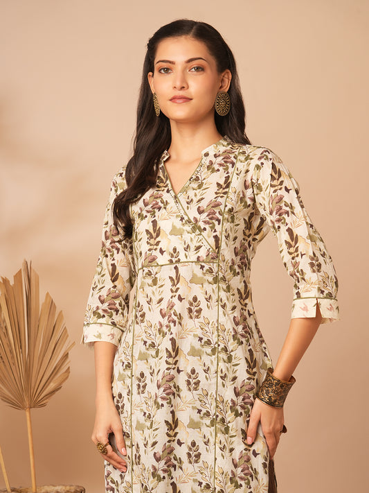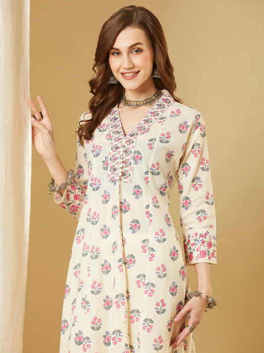 Ethnic Floral Printed Embroidered A-Line Pleated Kurta...