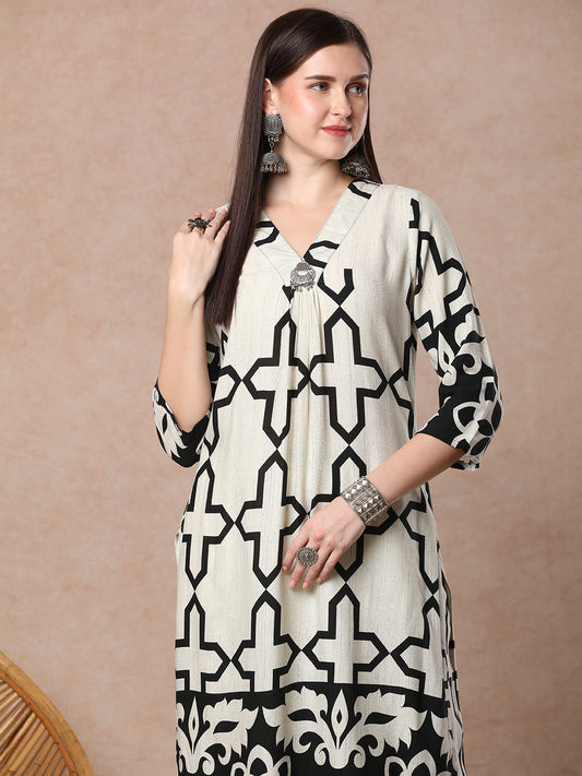 Ethnic Geometric Printed A-Line Pleated Co-ord Set...