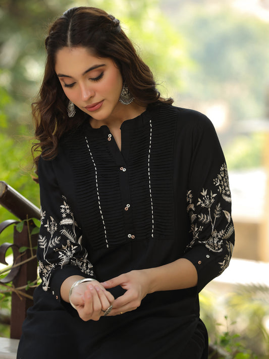 MRP (Inclusive of all taxes)Regular price ₹ 1,599.00₹ 1,599.00 Regular priceUnit price / per₹ 3,899.00Sale priceS M L XL 2XL 3XL add to cartSale{"id":7379331612758,"title":"Solid Floral Embroidered Straight Fit Co-ord Set - Black","handle":"solid-floral-embroidered-straight-fit-co-ord-set-black","description":"\u003ch1\u003eHighlights\u003c\/h1\u003e\n\u003cp\u003e\u003cbr\u003e-Straight Fit Kurta \u003cbr\u003e-Floral Embroidered Sleeves \u003cbr\u003e-Pin Tucked Yoke\u003c\/p\u003e\n\u003ch1\u003eFabric \u0026amp; Colour\u003c\/h1\u003e\n\u003cp\u003e\u003cbr\u003eTop Colour: Black\u003cbr\u003eTop Fabric: Viscose Rayon\u003cbr\u003eBottom Colour: Black\u003cbr\u003eBottom Fabric: Viscose Rayon\u003c\/p\u003e\n\u003ch1\u003eSpecifications\u003c\/h1\u003e\n\u003cp\u003e\u003cbr\u003eTop Design: Solid\u003cbr\u003eTop Craft: Plain and Prints\u003cbr\u003eTop Shape: Straight\u003cbr\u003eNeck: Mandarin Collar\u003cbr\u003eSleeve Length: Three-Quarter Sleeves\u003cbr\u003eTop Length: Knee Length\u003cbr\u003eHemline: Straight\u003cbr\u003eSlit: Side Slits\u003c\/p\u003e\n\u003cp\u003eBottom Type: Trousers\u003cbr\u003eBottom Closure: Slip-On\u003cbr\u003eWaistband: Elasticated\u003c\/p\u003e\n\u003cp\u003eWash Care: Hand Wash\u003c\/p\u003e\n\u003cp\u003eMeasurement (in inches)\u003cbr\u003eLength – 46, Sleeves – 17,\u003cbr\u003eBottom - 36\u003c\/p\u003e\n\u003cp\u003eModel’s Height: 5’7”. Wearing Size S.\u003c\/p\u003e\n\u003ch1\u003eProduct Information\u003c\/h1\u003e\n\u003cp\u003e\u003cbr\u003eManufactured\/Packed\/Marketed By:\u003cbr\u003eFashor Lifestyle Pvt. Ltd.\u003cbr\u003e28\/30, Sudarshanpura Industrial Area,\u003cbr\u003eJaipur - 302006.\u003cbr\u003eCountry of Origin: India\u003c\/p\u003e\n\u003c!----\u003e","published_at":"2024-10-16T10:51:34+05:30","created_at":"2024-08-10T15:07:54+05:30","vendor":"FASHOR","type":"2P Kurta Set","tags":["1001-2000","22714","2XL","All Styles","bs","casualwear","co-ord","colour_black","craft_plain-and-prints","design_solid","fabric_rayon","fabric_viscose-rayon","KURTI","kurtis","meta-size-chart-","mf","monsoo","S","shape_straight","workwear"],"price":159900,"price_min":159900,"price_max":159900,"available":true,"price_varies":false,"compare_at_price":389900,"compare_at_price_min":389900,"compare_at_price_max":389900,"compare_at_price_varies":false,"variants":[{"id":41862301024342,"title":"S","option1":"S","option2":null,"option3":null,"sku":"36-KBB22714D4FS","requires_shipping":true,"taxable":false,"featured_image":{"id":33724186067030,"product_id":7379331612758,"position":3,"created_at":"2024-11-27T15:28:35+05:30","updated_at":"2024-11-27T15:28:37+05:30","alt":null,"width":1080,"height":1440,"src":"\/\/fashor.com\/cdn\/shop\/files\/28759_8.jpg?v=1732701517","variant_ids":[41676475072598,41676475105366,41676475138134,41676475170902,41676475203670,41862301024342]},"available":true,"name":"Solid Floral Embroidered Straight Fit Co-ord Set - Black - S","public_title":"S","options":["S"],"price":159900,"weight":0,"compare_at_price":389900,"inventory_quantity":10,"inventory_management":"shopify","inventory_policy":"deny","barcode":"","featured_media":{"alt":null,"id":26239671140438,"position":3,"preview_image":{"aspect_ratio":0.75,"height":1440,"width":1080,"src":"\/\/fashor.com\/cdn\/shop\/files\/28759_8.jpg?v=1732701517"}},"requires_selling_plan":false,"selling_plan_allocations":[],"quantity_rule":{"min":1,"max":null,"increment":1}},{"id":41676475072598,"title":"M","option1":"M","option2":null,"option3":null,"sku":"38-KBB22714D4FS","requires_shipping":true,"taxable":false,"featured_image":{"id":33724186067030,"product_id":7379331612758,"position":3,"created_at":"2024-11-27T15:28:35+05:30","updated_at":"2024-11-27T15:28:37+05:30","alt":null,"width":1080,"height":1440,"src":"\/\/fashor.com\/cdn\/shop\/files\/28759_8.jpg?v=1732701517","variant_ids":[41676475072598,41676475105366,41676475138134,41676475170902,41676475203670,41862301024342]},"available":false,"name":"Solid Floral Embroidered Straight Fit Co-ord Set - Black - M","public_title":"M","options":["M"],"price":159900,"weight":0,"compare_at_price":389900,"inventory_quantity":0,"inventory_management":"shopify","inventory_policy":"deny","barcode":"","featured_media":{"alt":null,"id":26239671140438,"position":3,"preview_image":{"aspect_ratio":0.75,"height":1440,"width":1080,"src":"\/\/fashor.com\/cdn\/shop\/files\/28759_8.jpg?v=1732701517"}},"requires_selling_plan":false,"selling_plan_allocations":[],"quantity_rule":{"min":1,"max":null,"increment":1}},{"id":41676475105366,"title":"L","option1":"L","option2":null,"option3":null,"sku":"40-KBB22714D4FS","requires_shipping":true,"taxable":false,"featured_image":{"id":33724186067030,"product_id":7379331612758,"position":3,"created_at":"2024-11-27T15:28:35+05:30","updated_at":"2024-11-27T15:28:37+05:30","alt":null,"width":1080,"height":1440,"src":"\/\/fashor.com\/cdn\/shop\/files\/28759_8.jpg?v=1732701517","variant_ids":[41676475072598,41676475105366,41676475138134,41676475170902,41676475203670,41862301024342]},"available":false,"name":"Solid Floral Embroidered Straight Fit Co-ord Set - Black - L","public_title":"L","options":["L"],"price":159900,"weight":0,"compare_at_price":389900,"inventory_quantity":0,"inventory_management":"shopify","inventory_policy":"deny","barcode":"","featured_media":{"alt":null,"id":26239671140438,"position":3,"preview_image":{"aspect_ratio":0.75,"height":1440,"width":1080,"src":"\/\/fashor.com\/cdn\/shop\/files\/28759_8.jpg?v=1732701517"}},"requires_selling_plan":false,"selling_plan_allocations":[],"quantity_rule":{"min":1,"max":null,"increment":1}},{"id":41676475138134,"title":"XL","option1":"XL","option2":null,"option3":null,"sku":"42-KBB22714D4FS","requires_shipping":true,"taxable":false,"featured_image":{"id":33724186067030,"product_id":7379331612758,"position":3,"created_at":"2024-11-27T15:28:35+05:30","updated_at":"2024-11-27T15:28:37+05:30","alt":null,"width":1080,"height":1440,"src":"\/\/fashor.com
