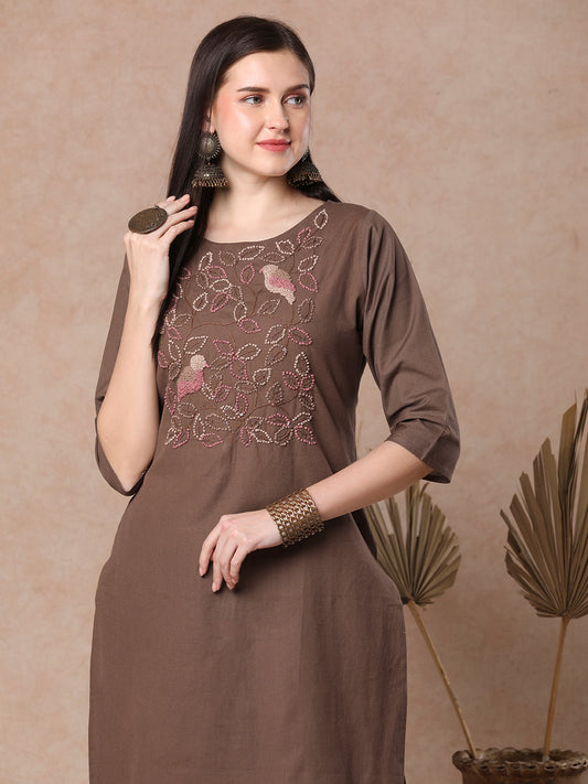 Solid Floral Hand Embroidered Straight Fit Co-ord...