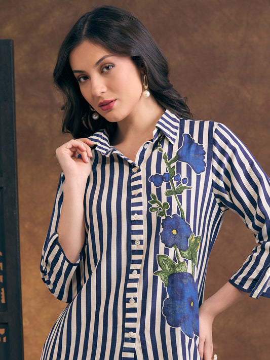 Abstract Floral & Stripes Printed Straight Fit...