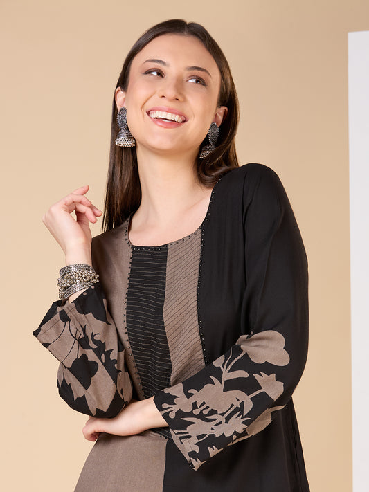 Ethnic Floral Printed Embroidered A-Line Pleated Kurta...