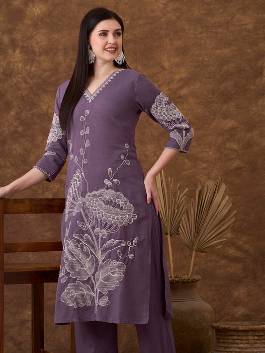 Solid Floral Embroidered Straight Fit Co-ord Set...