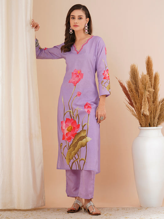 Solid Floral Hand Embroidered Straight Fit Co-ord...
