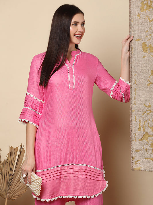 MRP (Inclusive of all taxes)Regular price ₹ 1,699.00₹ 1,699.00 Regular priceUnit price / per₹ 4,299.00Sale priceM L XL 2XL add to cartSale{"id":7542320627798,"title":"Solid Pin Tucked Straight Fit Co-ord Set - Pink","handle":"solid-pin-tucked-straight-fit-co-ord-set-pink-1","description":"\u003ch1\u003eHighlights\u003cbr\u003e\n\u003c\/h1\u003e\n\u003cp\u003e\u003cbr\u003e-This straight fit kurta with pin tucks detailing at front, features mandarin collar. Enhanced with crochet lace detailing all over, paired with solid matching pant. This ensemble offers both comfort and style. Ideal for everyday elegance, it’s a versatile outfit that transitions seamlessly from casual outings to more refined gatherings.\u003c\/p\u003e\n\u003ch1\u003eFabric \u0026amp; Colour\u003c\/h1\u003e\n\u003cp\u003e\u003cbr\u003eTop Colour: Pink\u003cbr\u003eTop Fabric: Viscose Rayon\u003cbr\u003eBottom Colour: Pink\u003cbr\u003eBottom Fabric: Viscose Rayon\u003c\/p\u003e\n\u003ch1\u003eSpecifications\u003c\/h1\u003e\n\u003cp\u003e\u003cbr\u003eTop Design: Solid\u003cbr\u003eTop Craft: Plain and Prints, Lace\u003cbr\u003eTop Shape: Straight\u003cbr\u003eNeck: Mandarin Collar\u003cbr\u003eSleeve Length: Short Sleeves\u003cbr\u003eTop Length: Above Knee\u003cbr\u003eHemline: Curved\u003cbr\u003eSlit: Side Slits\u003c\/p\u003e\n\u003cp\u003eBottom Type: Trousers\u003cbr\u003eBottom Closure: Slip-On\u003cbr\u003eWaistband: Partially Elasticated\u003c\/p\u003e\n\u003cp\u003eWash Care: Hand Wash\u003c\/p\u003e\n\u003cp\u003eLength (in inches)\u003cbr\u003eKurta – 36, Sleeves – 14\u003cbr\u003eBottom - 38\u003c\/p\u003e\n\u003cp\u003eModel’s Height: 5’7”. Wearing Size S.\u003c\/p\u003e\n\u003ch1\u003eProduct Information\u003c\/h1\u003e\n\u003cp\u003e\u003cbr\u003eManufactured\/Packed\/Marketed By:\u003cbr\u003eFashor Lifestyle Pvt. Ltd.\u003cbr\u003e28\/30, Sudarshanpura Industrial Area,\u003cbr\u003eJaipur - 302006.\u003cbr\u003eCountry of Origin: India\u003c\/p\u003e","published_at":"2025-04-21T13:40:02+05:30","created_at":"2025-04-19T16:29:41+05:30","vendor":"FASHOR","type":"2P Kurta Set","tags":["1001-2000","2XL","30670","All Styles","casualwear","co-ord","colour_pink","craft_lace","craft_plain-and-prints","design_solid","fabric_viscose-rayon","KURTI","kurtis","L","M","meta-size-chart-","now-trending","shape_straight","workwear","XL"],"price":169900,"price_min":169900,"price_max":169900,"available":true,"price_varies":false,"compare_at_price":429900,"compare_at_price_min":429900,"compare_at_price_max":429900,"compare_at_price_varies":false,"variants":[{"id":42257582850134,"title":"M","option1":"M","option2":null,"option3":null,"sku":"38-KBA30670C5FS","requires_shipping":true,"taxable":false,"featured_image":{"id":34292690649174,"product_id":7542320627798,"position":3,"created_at":"2025-04-19T16:30:17+05:30","updated_at":"2025-04-19T16:30:40+05:30","alt":null,"width":1080,"height":1440,"src":"\/\/fashor.com\/cdn\/shop\/files\/30574_6.jpg?v=1745060440","variant_ids":[42257582850134,42257582882902,42257582915670,42257582948438]},"available":true,"name":"Solid Pin Tucked Straight Fit Co-ord Set - Pink - M","public_title":"M","options":["M"],"price":169900,"weight":0,"compare_at_price":429900,"inventory_quantity":7,"inventory_management":"shopify","inventory_policy":"deny","barcode":"","featured_media":{"alt":null,"id":26668166840406,"position":3,"preview_image":{"aspect_ratio":0.75,"height":1440,"width":1080,"src":"\/\/fashor.com\/cdn\/shop\/files\/30574_6.jpg?v=1745060440"}},"requires_selling_plan":false,"selling_plan_allocations":[],"quantity_rule":{"min":1,"max":null,"increment":1}},{"id":42257582882902,"title":"L","option1":"L","option2":null,"option3":null,"sku":"40-KBA30670C5FS","requires_shipping":true,"taxable":false,"featured_image":{"id":34292690649174,"product_id":7542320627798,"position":3,"created_at":"2025-04-19T16:30:17+05:30","updated_at":"2025-04-19T16:30:40+05:30","alt":null,"width":1080,"height":1440,"src":"\/\/fashor.com\/cdn\/shop\/files\/30574_6.jpg?v=1745060440","variant_ids":[42257582850134,42257582882902,42257582915670,42257582948438]},"available":true,"name":"Solid Pin Tucked Straight Fit Co-ord Set - Pink - L","public_title":"L","options":["L"],"price":169900,"weight":0,"compare_at_price":429900,"inventory_quantity":4,"inventory_management":"shopify","inventory_policy":"deny","barcode":"","featured_media":{"alt":null,"id":26668166840406,"position":3,"preview_image":{"aspect_ratio":0.75,"height":1440,"width":1080,"src":"\/\/fashor.com\/cdn\/shop\/files\/30574_6.jpg?v=1745060440"}},"requires_selling_plan":false,"selling_plan_allocations":[],"quantity_rule":{"min":1,"max":null,"increment":1}},{"id":42257582915670,"title":"XL","option1":"XL","option2":null,"option3":null,"sku":"42-KBA30670C5FS","requires_shipping":true,"taxable":false,"featured_image":{"id":34292690649174,"product_id":7542320627798,"position":3,"created_at":"2025-04-19T16:30:17+05:30","updated_at":"2025-04-19T16:30:40+05:30","alt":null,"width":1080,"height":1440,"src":"\/\/fashor.com\/cdn\/shop\/files\/30574_6.jpg?v=1745060440","variant_ids":[42257582850134,42257582882902,42257582915670,42257582948438]},"available":true,"name":"Solid Pin Tucked Straight Fit Co-ord Set - Pink - XL","public_title":"XL","options":["XL"],"price":169900,"weight":0,"compare_at_price":429900,"inventory_quantity":2,"inventory_management":"shopify","inventory_policy":"deny","barcode":"","featured_media":{"alt":null,"id":26668166840406,"position":3,"preview_image":{"aspect_ratio":0.75,"height":1440,"width":1080,"src":"\/\/fashor.com\/cdn\/shop\/files\/30574_6.jpg?v=1745060440"}},"requires_selling_plan":false,"selling_plan_allocations":[],"quantity_rule":{"min":1,"max":null,"increment":1}},{"id":42257582948438,"title":"2XL","option1":"2XL","option2":null,"option3":null,"sku":"44-KBA30670C5FS","requires_shipping":true,"taxable":false,"featured_image":{"id":34292690649174,"product_id":7542320627798,"position":3,"created_at":"2025-04-19T16:30:1