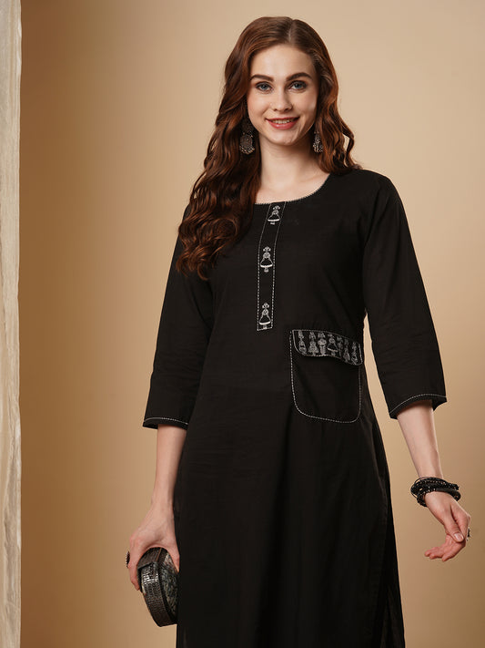 MRP (Inclusive of all taxes)Regular price ₹ 1,449.00₹ 1,449.00 Regular priceUnit price / per₹ 3,699.00Sale priceM L XL 2XL 3XL add to cartSale{"id":7544565891158,"title":"Solid Figurative Thread Embroidered Straight Fit Co-ord Set - Black","handle":"solid-figurative-thread-embroidered-straight-fit-co-ord-set-black","description":"\u003ch1\u003eHighlights\u003cbr\u003e\n\u003c\/h1\u003e\n\u003cp\u003e-Minimalist with a twist, this straight-fit black cotton co-ord set features a classic round neckline and is elevated by lady figurative thread embroidery on the front placket and patch pocket. A subtle statement piece that blends everyday ease with artistic detail.\u003cbr\u003eSoft on the skin and tailored for comfort, it’s a go-to look for effortless sophistication.\u003cbr\u003ePair it with sleek flats or bold accessories to suit your mood.\u003c\/p\u003e\n\u003ch1\u003eFabric \u0026amp; Colour\u003c\/h1\u003e\n\u003cp\u003e\u003cbr\u003eTop Colour: Black\u003cbr\u003eTop Fabric: Cotton\u003cbr\u003eBottom Colour: Black\u003cbr\u003eBottom Fabric: Cotton Blend\u003c\/p\u003e\n\u003ch1\u003eSpecifications\u003c\/h1\u003e\n\u003cp\u003e\u003cbr\u003eTop Design: Solid\u003cbr\u003eTop Craft: Embroidery, Plain and Prints\u003cbr\u003eTop Shape: Straight\u003cbr\u003eNeck: Round Neck\u003cbr\u003eSleeve Length: Three-Quarter Sleeves\u003cbr\u003eTop Length: Knee Length\u003cbr\u003eHemline: Straight\u003cbr\u003eSlit: Side Slits\u003c\/p\u003e\n\u003cp\u003eBottom Type: Palazzos\u003cbr\u003eBottom Closure: Slip-On\u003cbr\u003eWaistband: Elasticated\u003c\/p\u003e\n\u003cp\u003eWash Care: Hand Wash\u003c\/p\u003e\n\u003cp\u003eLength (in inches)\u003cbr\u003eKurta – 45, Sleeves – 17,\u003cbr\u003eBottom - 40\u003c\/p\u003e\n\u003cp\u003eModel’s Height: 5’7”. Wearing Size S.\u003c\/p\u003e\n\u003ch1\u003eProduct Information\u003c\/h1\u003e\n\u003cp\u003e\u003cbr\u003eManufactured\/Packed\/Marketed By:\u003cbr\u003eFashor Lifestyle Pvt. Ltd.\u003cbr\u003e28\/30, Sudarshanpura Industrial Area,\u003cbr\u003eJaipur - 302006.\u003cbr\u003eCountry of Origin: India\u003c\/p\u003e","published_at":"2025-04-25T13:34:56+05:30","created_at":"2025-04-25T13:01:17+05:30","vendor":"FASHOR","type":"2P Kurta Set","tags":["1001-2000","28233","2XL","3XL","All Styles","casualwear","colour_black","craft_embroidery","craft_plain-and-prints","design_solid","fabric_cotton","KURTI","kurtis","L","M","meta-size-chart-","monsoo","now-trending","shape_straight","workwear","XL"],"price":144900,"price_min":144900,"price_max":144900,"available":true,"price_varies":false,"compare_at_price":369900,"compare_at_price_min":369900,"compare_at_price_max":369900,"compare_at_price_varies":false,"variants":[{"id":42268484796502,"title":"M","option1":"M","option2":null,"option3":null,"sku":"38-KB028233A5FS","requires_shipping":true,"taxable":false,"featured_image":{"id":34312251998294,"product_id":7544565891158,"position":3,"created_at":"2025-04-25T13:07:15+05:30","updated_at":"2025-04-25T13:07:52+05:30","alt":null,"width":1080,"height":1440,"src":"\/\/fashor.com\/cdn\/shop\/files\/30717_7.jpg?v=1745566672","variant_ids":[42268484796502,42268484829270,42268484862038,42268484894806,42268484927574]},"available":true,"name":"Solid Figurative Thread Embroidered Straight Fit Co-ord Set - Black - M","public_title":"M","options":["M"],"price":144900,"weight":0,"compare_at_price":369900,"inventory_quantity":7,"inventory_management":"shopify","inventory_policy":"deny","barcode":"","featured_media":{"alt":null,"id":26683863793750,"position":3,"preview_image":{"aspect_ratio":0.75,"height":1440,"width":1080,"src":"\/\/fashor.com\/cdn\/shop\/files\/30717_7.jpg?v=1745566672"}},"requires_selling_plan":false,"selling_plan_allocations":[],"quantity_rule":{"min":1,"max":null,"increment":1}},{"id":42268484829270,"title":"L","option1":"L","option2":null,"option3":null,"sku":"40-KB028233A5FS","requires_shipping":true,"taxable":false,"featured_image":{"id":34312251998294,"product_id":7544565891158,"position":3,"created_at":"2025-04-25T13:07:15+05:30","updated_at":"2025-04-25T13:07:52+05:30","alt":null,"width":1080,"height":1440,"src":"\/\/fashor.com\/cdn\/shop\/files\/30717_7.jpg?v=1745566672","variant_ids":[42268484796502,42268484829270,42268484862038,42268484894806,42268484927574]},"available":true,"name":"Solid Figurative Thread Embroidered Straight Fit Co-ord Set - Black - L","public_title":"L","options":["L"],"price":144900,"weight":0,"compare_at_price":369900,"inventory_quantity":4,"inventory_management":"shopify","inventory_policy":"deny","barcode":"","featured_media":{"alt":null,"id":26683863793750,"position":3,"preview_image":{"aspect_ratio":0.75,"height":1440,"width":1080,"src":"\/\/fashor.com\/cdn\/shop\/files\/30717_7.jpg?v=1745566672"}},"requires_selling_plan":false,"selling_plan_allocations":[],"quantity_rule":{"min":1,"max":null,"increment":1}},{"id":42268484862038,"title":"XL","option1":"XL","option2":null,"option3":null,"sku":"42-KB028233A5FS","requires_shipping":true,"taxable":false,"featured_image":{"id":34312251998294,"product_id":7544565891158,"position":3,"created_at":"2025-04-25T13:07:15+05:30","updated_at":"2025-04-25T13:07:52+05:30","alt":null,"width":1080,"height":1440,"src":"\/\/fashor.com\/cdn\/shop\/files\/30717_7.jpg?v=1745566672","variant_ids":[42268484796502,42268484829270,42268484862038,42268484894806,42268484927574]},"available":true,"name":"Solid Figurative Thread Embroidered Straight Fit Co-ord Set - Black - XL","public_title":"XL","options":["XL"],"price":144900,"weight":0,"compare_at_price":369900,"inventory_quantity":5,"inventory_management":"shopify","inventory_policy":"deny","barcode":"","featured_media":{"alt":null,"id":26683863793750,"position":3,"preview_image":{"aspect_ratio":0.75,"height":1440,"width":1080,"src":"\/\/fashor.com\/cdn\/shop\/files\/30717_7.jpg?v=1745566672"}},"requires_selling_plan":false,"selling_plan_allocations":[],"quantity_rule":{"min":1,"max":null,"increment":1}},{"id":42268