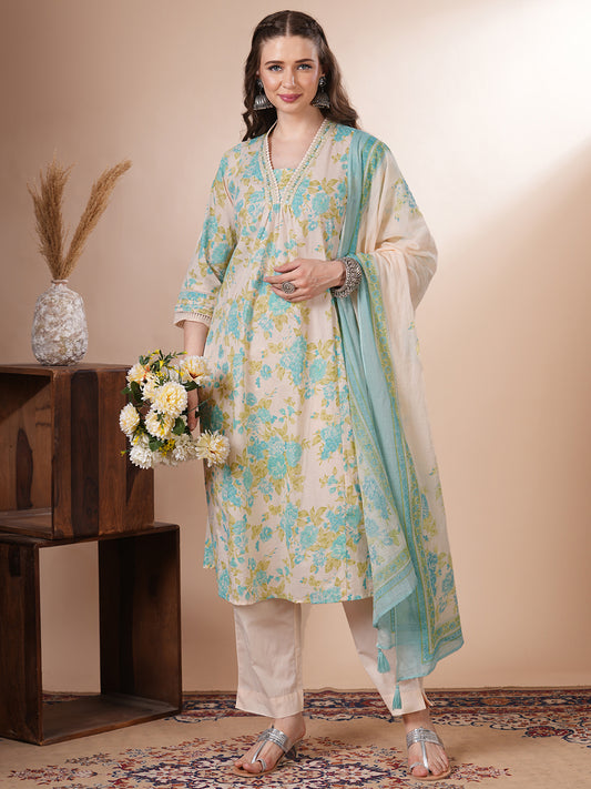 Ethnic Floral Printed Embroidered A-Line Pleated Kurta...