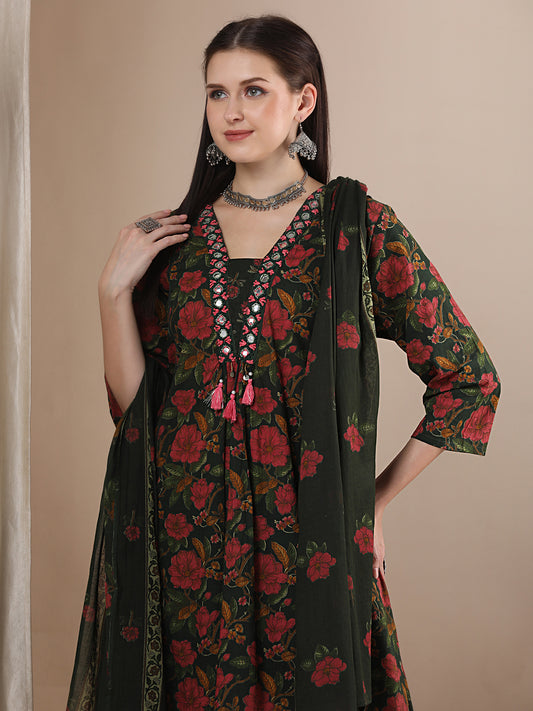 Ethnic Floral Printed Embroidered A-Line Kurta with...