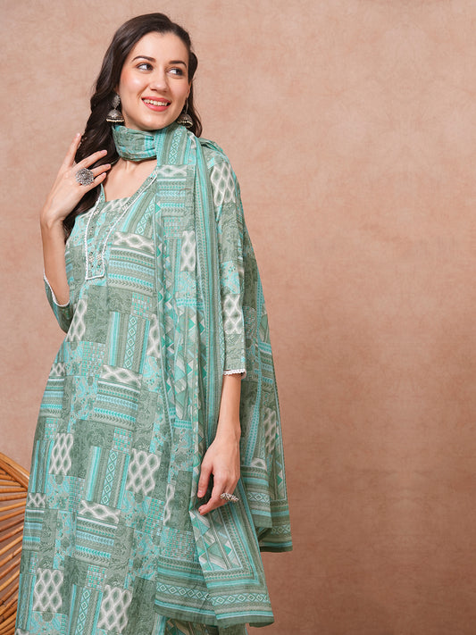 Ethnic Printed Anarkali Flared Kurta with Pant...