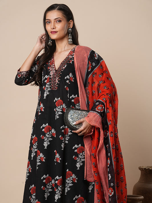 Ethnic Floral Printed & Embroidered Straight Fit...