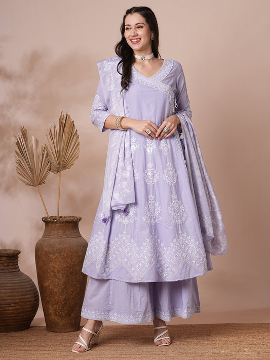 Solid Floral Embroidered Angrakha Kurta with Flared...