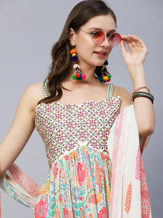 Floral Printed Mirror Embroidered Flared Kurta With...