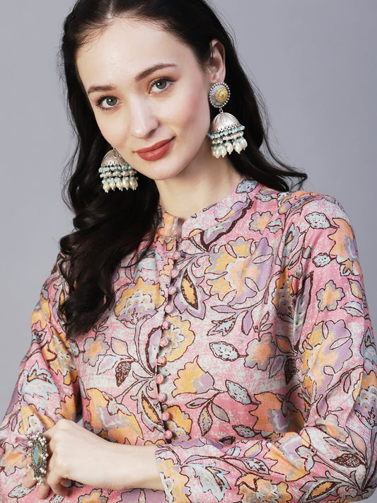 Floral Printed Wooden Buttoned Pin-Tucks Kurta with...