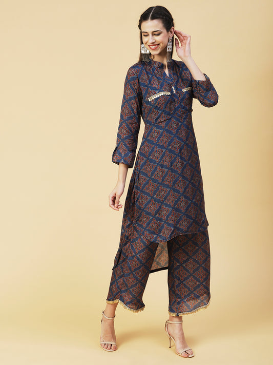 Ajarak Printed Hand Embroidered Asymmetric Hem Kurta...
