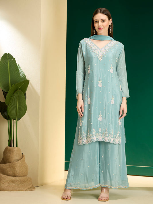 MRP (Inclusive of all taxes)Regular price ₹ 5,499.00₹ 5,499.00 Regular priceUnit price / per₹ 13,799.00Sale priceM L XL 2XL add to cartSale{"id":7700880031830,"title":"Solid Floral Hand Embroidered Straight Kurta with Palazzo \u0026 Dupatta - Blue","handle":"solid-floral-hand-embroidered-straight-kurta-with-palazzo-dupatta-blue","description":"\u003ch1\u003eHighlights\u003c\/h1\u003e\n\u003cp\u003e\u003cbr\u003e\u003cbr\u003e-Radiate festive elegance in this Solid Floral Hand-Embroidered Straight Kurta Set in a rich Blue hue. Crafted from luxurious chinnon chiffon, the kurta features exquisite hand embroidery that adds a delicate shimmer to its graceful V-neck silhouette. Paired with flared palazzo pants for effortless movement and a soft chiffon dupatta that drapes beautifully, this ensemble embodies timeless sophistication—perfect for celebrations, soirées, or any occasion where you wish to shine.\u003c\/p\u003e\n\u003ch1\u003e\n\u003cbr\u003eFabric \u0026amp; Colour\u003c\/h1\u003e\n\u003cp\u003e\u003cbr\u003eTop Colour: Blue\u003cbr\u003eTop Fabric: Poly Chiffon\u003cbr\u003eBottom Colour: Blue\u003cbr\u003eBottom Fabric: Poly Chiffon\u003cbr\u003eDupatta Colour: Blue\u003cbr\u003eDupatta Fabric: Poly Chiffon\u003c\/p\u003e\n\u003ch1\u003eSpecifications\u003c\/h1\u003e\n\u003cp\u003e\u003cbr\u003eTop Design: Solid\u003cbr\u003eTop Craft: Sequins, Embroidery, Plain and Prints\u003cbr\u003eTop Shape: Straight\u003cbr\u003eNeck: V-Neck\u003cbr\u003eSleeve Length: Three-Quarter Sleeves\u003cbr\u003eTop Length: Knee Length\u003cbr\u003eHemline: Straight\u003cbr\u003eSlit: Side Slits\u003c\/p\u003e\n\u003cp\u003eBottom Type: Palazzos\u003cbr\u003eBottom Closure: Slip-On\u003cbr\u003eWaistband: Partially Elasticated\u003c\/p\u003e\n\u003cp\u003eDupatta Pattern: Embroidered, Solid\u003cbr\u003eDupatta Border: Solid\u003c\/p\u003e\n\u003cp\u003eWash Care: Dry Clean\u003c\/p\u003e\n\u003cp\u003eLength (in inches)\u003cbr\u003eKurta – 38, Sleeves – 17,\u003cbr\u003eBottom – 40\u003c\/p\u003e\n\u003cp\u003eModel’s Height: 5’7”. Wearing Size S.\u003c\/p\u003e\n\u003ch1\u003eProduct Information\u003c\/h1\u003e\n\u003cp\u003e\u003cbr\u003eManufactured\/Packed\/Marketed By:\u003cbr\u003eFashor Lifestyle Pvt. Ltd.\u003cbr\u003e28\/30, Sudarshanpura Industrial Area,\u003cbr\u003eJaipur - 302006.\u003cbr\u003eCountry of Origin: India\u003c\/p\u003e","published_at":"2025-12-09T11:20:35+05:30","created_at":"2025-11-06T12:31:31+05:30","vendor":"FASHOR","type":"3P Kurta Set","tags":["33460","above-3000","All Styles","colour_blue","craft_embroidery","craft_plain-and-prints","craft_sequins","design_solid","fabric_poly-chiffon","KURTI","kurtis","meta-size-chart-","now-trending","occasionwear","shape_straight","XL"],"price":549900,"price_min":549900,"price_max":549900,"available":true,"price_varies":false,"compare_at_price":1379900,"compare_at_price_min":1379900,"compare_at_price_max":1379900,"compare_at_price_varies":false,"variants":[{"id":43586676818006,"title":"M","option1":"M","option2":null,"option3":null,"sku":"38-ST033460J5FS","requires_shipping":true,"taxable":false,"featured_image":{"id":35565115211862,"product_id":7700880031830,"position":2,"created_at":"2025-11-06T12:32:02+05:30","updated_at":"2025-11-06T12:33:05+05:30","alt":null,"width":1080,"height":1440,"src":"\/\/fashor.com\/cdn\/shop\/files\/32646_1.jpg?v=1762412585","variant_ids":[43586676818006,43586676850774,43586676883542,43586676916310]},"available":false,"name":"Solid Floral Hand Embroidered Straight Kurta with Palazzo \u0026 Dupatta - Blue - M","public_title":"M","options":["M"],"price":549900,"weight":0,"compare_at_price":1379900,"inventory_quantity":0,"inventory_management":"shopify","inventory_policy":"deny","barcode":"","featured_media":{"alt":null,"id":27649906114646,"position":2,"preview_image":{"aspect_ratio":0.75,"height":1440,"width":1080,"src":"\/\/fashor.com\/cdn\/shop\/files\/32646_1.jpg?v=1762412585"}},"requires_selling_plan":false,"selling_plan_allocations":[],"quantity_rule":{"min":1,"max":null,"increment":1}},{"id":43586676850774,"title":"L","option1":"L","option2":null,"option3":null,"sku":"40-ST033460J5FS","requires_shipping":true,"taxable":false,"featured_image":{"id":35565115211862,"product_id":7700880031830,"position":2,"created_at":"2025-11-06T12:32:02+05:30","updated_at":"2025-11-06T12:33:05+05:30","alt":null,"width":1080,"height":1440,"src":"\/\/fashor.com\/cdn\/shop\/files\/32646_1.jpg?v=1762412585","variant_ids":[43586676818006,43586676850774,43586676883542,43586676916310]},"available":false,"name":"Solid Floral Hand Embroidered Straight Kurta with Palazzo \u0026 Dupatta - Blue - L","public_title":"L","options":["L"],"price":549900,"weight":0,"compare_at_price":1379900,"inventory_quantity":0,"inventory_management":"shopify","inventory_policy":"deny","barcode":"","featured_media":{"alt":null,"id":27649906114646,"position":2,"preview_image":{"aspect_ratio":0.75,"height":1440,"width":1080,"src":"\/\/fashor.com\/cdn\/shop\/files\/32646_1.jpg?v=1762412585"}},"requires_selling_plan":false,"selling_plan_allocations":[],"quantity_rule":{"min":1,"max":null,"increment":1}},{"id":43586676883542,"title":"XL","option1":"XL","option2":null,"option3":null,"sku":"42-ST033460J5FS","requires_shipping":true,"taxable":false,"featured_image":{"id":35565115211862,"product_id":7700880031830,"position":2,"created_at":"2025-11-06T12:32:02+05:30","updated_at":"2025-11-06T12:33:05+05:30","alt":null,"width":1080,"height":1440,"src":"\/\/fashor.com\/cdn\/shop\/files\/32646_1.jpg?v=1762412585","variant_ids":[43586676818006,43586676850774,43586676883542,43586676916310]},"available":true,"name":"Solid Floral Hand Embroidered Straight Kurta with Palazzo \u0026 Dupatta - Blue - XL","public_title":"XL","options":["XL"],"price":549900,"weight":0,"compare_at_price":1379900,"inventory_quantity":1,"inventory_management":"shopify","inventory_policy":"deny","barcode":"","featured_media":{"alt":null,"id":27649906114646,"position":