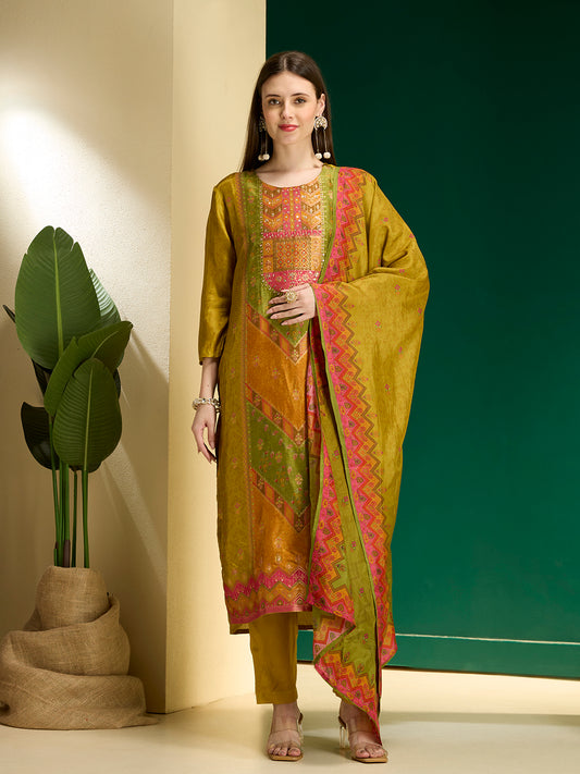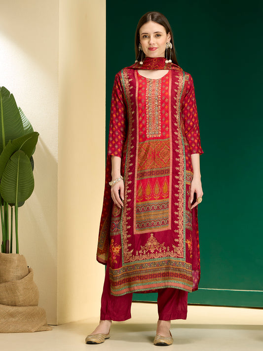 Ethnic Floral Printed & Embroidered Straight &...