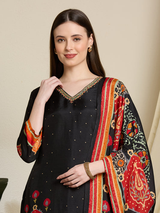 MRP (Inclusive of all taxes)Regular price ₹ 3,749.00₹ 3,749.00 Regular priceUnit price / per₹ 9,399.00Sale priceM L XL 2XL add to cartSale{"id":7678219812950,"title":"Solid Ethnic Printed Embroidered Straight Kurta with Pant \u0026 Dupatta - Black","handle":"solid-ethnic-printed-embroidered-straight-kurta-with-pant-dupatta-black-1","description":"\u003ch1\u003eHighlights\u003c\/h1\u003e\n\u003cp\u003e\u003cbr\u003e\u003cbr\u003e-Featuring a V-neckline adorned with intricate beads, sequins, and zari work, the kurta beautifully blends tradition with subtle glamour. It is paired with a solid palazzo and a gracefully printed dupatta, making it a perfect pick for festive evenings and special gatherings.\u003c\/p\u003e\n\u003ch1\u003e\n\u003cbr\u003eFabric \u0026amp; Colour\u003c\/h1\u003e\n\u003cp\u003e\u003cbr\u003eTop Colour: Black\u003cbr\u003eTop Fabric: Muslin Silk\u003cbr\u003eBottom Colour: Black\u003cbr\u003eBottom Fabric: Shantoon\u003cbr\u003eDupatta Colour: Black\u003cbr\u003eDupatta Fabric: Muslin Silk\u003c\/p\u003e\n\u003ch1\u003eSpecifications\u003c\/h1\u003e\n\u003cp\u003e\u003cbr\u003eTop Design: Solid\u003cbr\u003eTop Craft: Embroidery, Plain and Prints\u003cbr\u003eTop Shape: Straight\u003cbr\u003eNeck: V-Neck\u003cbr\u003eSleeve Length: Three-Quarter Sleeves\u003cbr\u003eTop Length: Calf Length\u003cbr\u003eHemline: Straight\u003cbr\u003eSlit: Side Slits\u003c\/p\u003e\n\u003cp\u003eBottom Type: Trousers\u003cbr\u003eBottom Closure: Slip-On\u003cbr\u003eWaistband: Elasticated\u003c\/p\u003e\n\u003cp\u003eDupatta Pattern: Printed\u003cbr\u003eDupatta Border: Printed\u003c\/p\u003e\n\u003cp\u003eWash Care: Hand Wash\u003c\/p\u003e\n\u003cp\u003eLength (in inches)\u003cbr\u003eKurta – 46, Sleeves – 17,\u003cbr\u003eBottom – 38\u003c\/p\u003e\n\u003cp\u003eModel’s Height: 5’7”. Wearing Size S.\u003c\/p\u003e\n\u003ch1\u003eProduct Information\u003c\/h1\u003e\n\u003cp\u003e\u003cbr\u003eManufactured\/Packed\/Marketed By:\u003cbr\u003eFashor Lifestyle Pvt. Ltd.\u003cbr\u003e28\/30, Sudarshanpura Industrial Area,\u003cbr\u003eJaipur - 302006.\u003cbr\u003eCountry of Origin: India\u003c\/p\u003e","published_at":"2025-10-17T12:09:09+05:30","created_at":"2025-10-17T11:11:29+05:30","vendor":"FASHOR","type":"3P Kurta Set","tags":["2XL","32845","above-3000","All Styles","casualwear","colour_black","craft_embroidery","craft_plain-and-prints","design_solid","fabric_muslin-silk","KURTI","kurtis","meta-size-chart-","now-trending","shape_straight","XL"],"price":374900,"price_min":374900,"price_max":374900,"available":true,"price_varies":false,"compare_at_price":939900,"compare_at_price_min":939900,"compare_at_price_max":939900,"compare_at_price_varies":false,"variants":[{"id":43479854907478,"title":"M","option1":"M","option2":null,"option3":null,"sku":"38-ST032845I5FS","requires_shipping":true,"taxable":false,"featured_image":{"id":35415905763414,"product_id":7678219812950,"position":3,"created_at":"2025-10-17T11:12:04+05:30","updated_at":"2025-10-17T11:12:49+05:30","alt":null,"width":1080,"height":1440,"src":"\/\/fashor.com\/cdn\/shop\/files\/32444_1.jpg?v=1760679769","variant_ids":[43479854907478,43479854940246,43479854973014,43479855005782]},"available":false,"name":"Solid Ethnic Printed Embroidered Straight Kurta with Pant \u0026 Dupatta - Black - M","public_title":"M","options":["M"],"price":374900,"weight":0,"compare_at_price":939900,"inventory_quantity":0,"inventory_management":"shopify","inventory_policy":"deny","barcode":"","featured_media":{"alt":null,"id":27523098345558,"position":3,"preview_image":{"aspect_ratio":0.75,"height":1440,"width":1080,"src":"\/\/fashor.com\/cdn\/shop\/files\/32444_1.jpg?v=1760679769"}},"requires_selling_plan":false,"selling_plan_allocations":[],"quantity_rule":{"min":1,"max":null,"increment":1}},{"id":43479854940246,"title":"L","option1":"L","option2":null,"option3":null,"sku":"40-ST032845I5FS","requires_shipping":true,"taxable":false,"featured_image":{"id":35415905763414,"product_id":7678219812950,"position":3,"created_at":"2025-10-17T11:12:04+05:30","updated_at":"2025-10-17T11:12:49+05:30","alt":null,"width":1080,"height":1440,"src":"\/\/fashor.com\/cdn\/shop\/files\/32444_1.jpg?v=1760679769","variant_ids":[43479854907478,43479854940246,43479854973014,43479855005782]},"available":false,"name":"Solid Ethnic Printed Embroidered Straight Kurta with Pant \u0026 Dupatta - Black - L","public_title":"L","options":["L"],"price":374900,"weight":0,"compare_at_price":939900,"inventory_quantity":0,"inventory_management":"shopify","inventory_policy":"deny","barcode":"","featured_media":{"alt":null,"id":27523098345558,"position":3,"preview_image":{"aspect_ratio":0.75,"height":1440,"width":1080,"src":"\/\/fashor.com\/cdn\/shop\/files\/32444_1.jpg?v=1760679769"}},"requires_selling_plan":false,"selling_plan_allocations":[],"quantity_rule":{"min":1,"max":null,"increment":1}},{"id":43479854973014,"title":"XL","option1":"XL","option2":null,"option3":null,"sku":"42-ST032845I5FS","requires_shipping":true,"taxable":false,"featured_image":{"id":35415905763414,"product_id":7678219812950,"position":3,"created_at":"2025-10-17T11:12:04+05:30","updated_at":"2025-10-17T11:12:49+05:30","alt":null,"width":1080,"height":1440,"src":"\/\/fashor.com\/cdn\/shop\/files\/32444_1.jpg?v=1760679769","variant_ids":[43479854907478,43479854940246,43479854973014,43479855005782]},"available":true,"name":"Solid Ethnic Printed Embroidered Straight Kurta with Pant \u0026 Dupatta - Black - XL","public_title":"XL","options":["XL"],"price":374900,"weight":0,"compare_at_price":939900,"inventory_quantity":1,"inventory_management":"shopify","inventory_policy":"deny","barcode":"","featured_media":{"alt":null,"id":27523098345558,"position":3,"preview_image":{"aspect_ratio":0.75,"height":1440,"width":1080,"src":"\/\/fashor.com\/cdn\/shop\/files\/32444_1.jpg?v=1760679769"}},"requires_selling_plan":false,"selling_plan_allocations":[],"quantity_rule":{"min":1,"max":null,"increment":1}},{"id":4