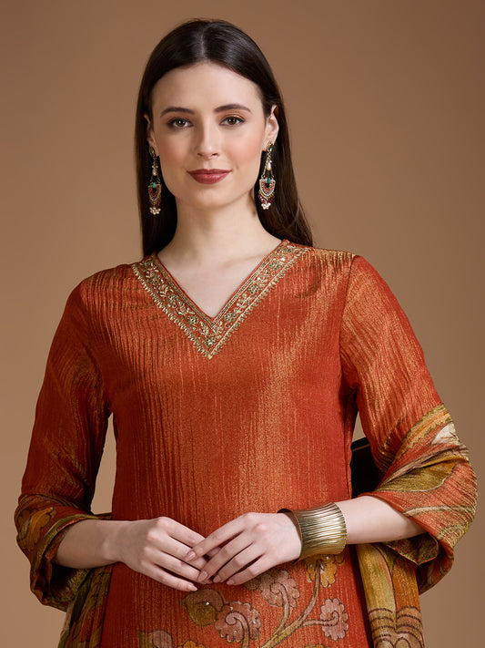 Festive Floral Printed Embroidered Tissue Kurta with...