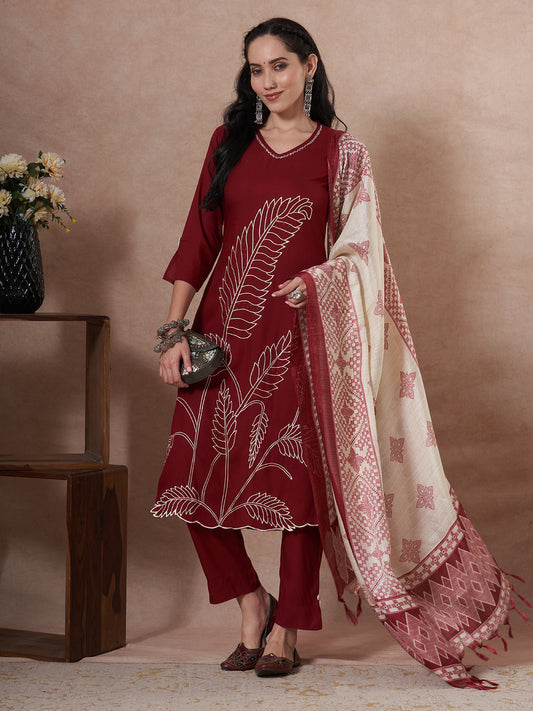 MRP (Inclusive of all taxes)Regular price ₹ 2,099.00₹ 2,099.00 Regular priceUnit price / per₹ 5,299.00Sale priceM L XL 2XL 3XL add to cartSale{"id":7665557078102,"title":"Solid Abstract Embroidered Straight Fit Kurta with Pant and Printed Dupatta - Maroon","handle":"stb31940g5fs","description":"\u003ch1\u003eHighlights\u003cbr\u003e\n\u003c\/h1\u003e\n\u003cp\u003e\u003cbr\u003e-Elevate your ethnic charm with this Solid Abstract Embroidered Straight Fit Kurta Set in rich maroon, crafted from soft viscose rayon. Designed with a flattering V-neckline and delicate threadwork embroidery at the front, it pairs effortlessly with a solid pant and a beautifully printed dupatta for a touch of elegance.\u003c\/p\u003e\n\u003ch1\u003e\n\u003cbr\u003eFabric \u0026amp; Colour\u003c\/h1\u003e\n\u003cp\u003e\u003cbr\u003eTop Colour: Maroon\u003cbr\u003eTop Fabric: Viscose Rayon\u003cbr\u003eBottom Colour: Maroon\u003cbr\u003eBottom Fabric: Viscose Rayon\u003cbr\u003eDupatta Colour: Cream\u003cbr\u003eDupatta Fabric: Poly Chanderi\u003c\/p\u003e\n\u003ch1\u003eSpecifications\u003c\/h1\u003e\n\u003cp\u003e\u003cbr\u003eTop Design: Abstract print, Solid\u003cbr\u003eTop Craft: Embroidery, Plain and Prints\u003cbr\u003eTop Shape: Straight\u003cbr\u003eNeck: V-Neck\u003cbr\u003eSleeve Length: Three-Quarter Sleeves\u003cbr\u003eTop Length: Knee Length\u003cbr\u003eHemline: Straight\u003cbr\u003eSlit: Side Slits\u003c\/p\u003e\n\u003cp\u003eBottom Type: Trousers\u003cbr\u003eBottom Closure: Slip-On\u003cbr\u003eWaistband: Elasticated\u003c\/p\u003e\n\u003cp\u003eDupatta Pattern: Printed\u003cbr\u003eDupatta Border: Tassels\u003c\/p\u003e\n\u003cp\u003eWash Care: Hand Wash\u003c\/p\u003e\n\u003cp\u003eLength (in inches)\u003cbr\u003eKurta – 45, Sleeves – 17,\u003cbr\u003eBottom – 36\u003c\/p\u003e\n\u003cp\u003eModel’s Height: 5’7”. Wearing Size S.\u003c\/p\u003e\n\u003ch1\u003eProduct Information\u003c\/h1\u003e\n\u003cp\u003e\u003cbr\u003eManufactured\/Packed\/Marketed By:\u003cbr\u003eFashor Lifestyle Pvt. Ltd.\u003cbr\u003e28\/30, Sudarshanpura Industrial Area,\u003cbr\u003eJaipur - 302006.\u003cbr\u003eCountry of Origin: India\u003c\/p\u003e","published_at":"2025-10-01T18:13:11+05:30","created_at":"2025-10-01T07:09:13+05:30","vendor":"FASHOR","type":"3P Kurta Set","tags":["2001-3000","2XL","31940","3XL","All Styles","casualwear","colour_maroon","craft_embroidery","craft_plain-and-prints","design_abstract-print","design_solid","fabric_viscose-rayon","KURTI","kurtis","L","M","meta-size-chart-","now-trending","shape_straight","XL"],"price":209900,"price_min":209900,"price_max":209900,"available":true,"price_varies":false,"compare_at_price":529900,"compare_at_price_min":529900,"compare_at_price_max":529900,"compare_at_price_varies":false,"variants":[{"id":43416951029846,"title":"M","option1":"M","option2":null,"option3":null,"sku":"38-STB31940G5FS","requires_shipping":true,"taxable":false,"featured_image":{"id":35310198259798,"product_id":7665557078102,"position":2,"created_at":"2025-10-01T17:54:44+05:30","updated_at":"2025-10-01T18:13:37+05:30","alt":null,"width":1080,"height":1440,"src":"\/\/fashor.com\/cdn\/shop\/files\/32276_4.jpg?v=1759322617","variant_ids":[43416951029846,43416951062614,43416951095382,43416951128150,43416951160918]},"available":true,"name":"Solid Abstract Embroidered Straight Fit Kurta with Pant and Printed Dupatta - Maroon - M","public_title":"M","options":["M"],"price":209900,"weight":0,"compare_at_price":529900,"inventory_quantity":6,"inventory_management":"shopify","inventory_policy":"deny","barcode":"","featured_media":{"alt":null,"id":27421596581974,"position":2,"preview_image":{"aspect_ratio":0.75,"height":1440,"width":1080,"src":"\/\/fashor.com\/cdn\/shop\/files\/32276_4.jpg?v=1759322617"}},"requires_selling_plan":false,"selling_plan_allocations":[],"quantity_rule":{"min":1,"max":null,"increment":1}},{"id":43416951062614,"title":"L","option1":"L","option2":null,"option3":null,"sku":"40-STB31940G5FS","requires_shipping":true,"taxable":false,"featured_image":{"id":35310198259798,"product_id":7665557078102,"position":2,"created_at":"2025-10-01T17:54:44+05:30","updated_at":"2025-10-01T18:13:37+05:30","alt":null,"width":1080,"height":1440,"src":"\/\/fashor.com\/cdn\/shop\/files\/32276_4.jpg?v=1759322617","variant_ids":[43416951029846,43416951062614,43416951095382,43416951128150,43416951160918]},"available":true,"name":"Solid Abstract Embroidered Straight Fit Kurta with Pant and Printed Dupatta - Maroon - L","public_title":"L","options":["L"],"price":209900,"weight":0,"compare_at_price":529900,"inventory_quantity":6,"inventory_management":"shopify","inventory_policy":"deny","barcode":"","featured_media":{"alt":null,"id":27421596581974,"position":2,"preview_image":{"aspect_ratio":0.75,"height":1440,"width":1080,"src":"\/\/fashor.com\/cdn\/shop\/files\/32276_4.jpg?v=1759322617"}},"requires_selling_plan":false,"selling_plan_allocations":[],"quantity_rule":{"min":1,"max":null,"increment":1}},{"id":43416951095382,"title":"XL","option1":"XL","option2":null,"option3":null,"sku":"42-STB31940G5FS","requires_shipping":true,"taxable":false,"featured_image":{"id":35310198259798,"product_id":7665557078102,"position":2,"created_at":"2025-10-01T17:54:44+05:30","updated_at":"2025-10-01T18:13:37+05:30","alt":null,"width":1080,"height":1440,"src":"\/\/fashor.com\/cdn\/shop\/files\/32276_4.jpg?v=1759322617","variant_ids":[43416951029846,43416951062614,43416951095382,43416951128150,43416951160918]},"available":true,"name":"Solid Abstract Embroidered Straight Fit Kurta with Pant and Printed Dupatta - Maroon - XL","public_title":"XL","options":["XL"],"price":209900,"weight":0,"compare_at_price":529900,"inventory_quantity":5,"inventory_management":"shopify","inventory_policy":"deny","barcode":"","featured_media":{"alt":null,"id":27421596581974,"position":2,"preview_image":{"aspect_ratio":0.75,"height":1440,"width":1080,"src":"\/\/fashor.com\/cdn\/shop\/files\/32276_4.jpg?v=1759322617"}},"r