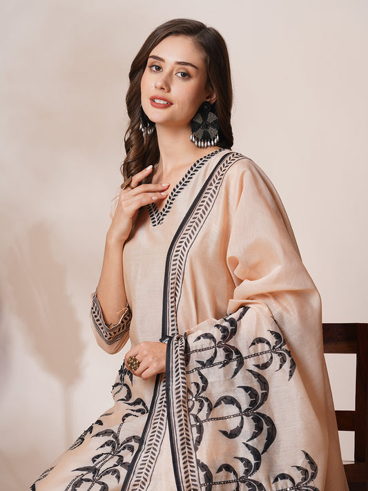 Floral Leaf Printed & Embroidered Straight Kurta...