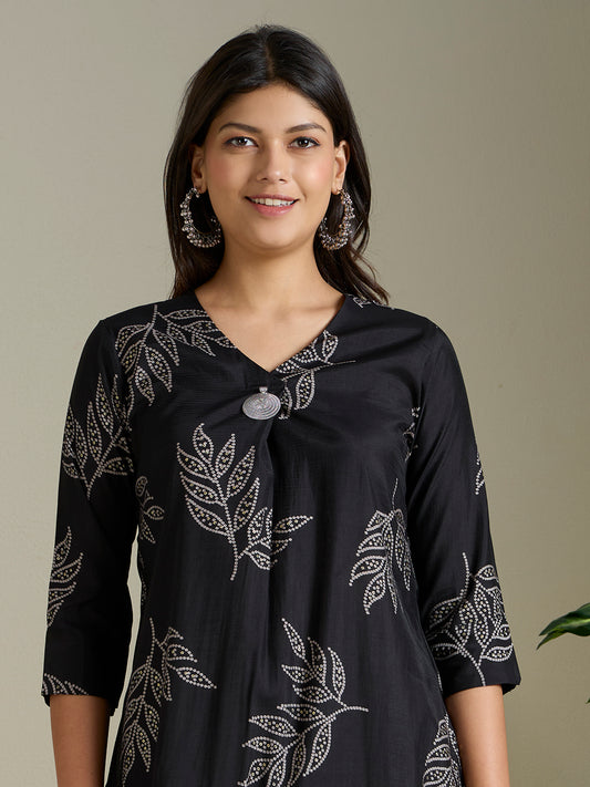 MRP (Inclusive of all taxes)Regular price ₹ 1,799.00₹ 1,799.00 Regular priceUnit price / per₹ 4,499.00Sale priceM L XL 2XL 3XL add to cartSale{"id":7736365940822,"title":"Floral Foil \u0026 Printed A-Line Co-ord Set - Black","handle":"floral-foil-printed-a-line-co-ord-set-black","description":"\u003ch1\u003eHighlights\u003c\/h1\u003e\n\u003cp\u003e\u003cbr\u003e\u003cbr\u003e-Crafted from luxe muslin silk fabric, this elegant ensemble features a flattering V-neckline adorned with intricate oxidised trim. The floral print adds a touch of contemporary flair, making it the perfect pick for festive gatherings or evening outings.\u003c\/p\u003e\n\u003ch1\u003e\n\u003cbr\u003eFabric \u0026amp; Colour\u003c\/h1\u003e\n\u003cp\u003e\u003cbr\u003eTop Colour: Black\u003cbr\u003eTop Fabric: Modal\u003cbr\u003eBottom Colour: Black\u003cbr\u003eBottom Fabric: Viscose Rayon\u003c\/p\u003e\n\u003ch1\u003eSpecifications\u003c\/h1\u003e\n\u003cp\u003e\u003cbr\u003eTop Design: Floral print, Abstract print\u003cbr\u003eTop Craft: Mirror work, Plain and Prints\u003cbr\u003eTop Shape: A-line\u003cbr\u003eNeck: V-Neck\u003cbr\u003eSleeve Length: Three-Quarter Sleeves\u003cbr\u003eTop Length: Knee Length\u003cbr\u003eHemline: Curved\u003cbr\u003eSlit: Side Slits\u003c\/p\u003e\n\u003cp\u003eBottom Type: Palazzos\u003cbr\u003eBottom Closure: Slip-On\u003cbr\u003eWaistband: Partially Elasticated\u003c\/p\u003e\n\u003cp\u003eWash Care: Hand Wash\u003c\/p\u003e\n\u003cp\u003eLength (in inches)\u003cbr\u003eKurta – 47, Sleeves – 17,\u003cbr\u003eBottom - 40\u003c\/p\u003e\n\u003cp\u003eModel’s Height: 5’7”. Wearing Size S.\u003c\/p\u003e\n\u003ch1\u003eProduct Information\u003c\/h1\u003e\n\u003cp\u003e\u003cbr\u003eManufactured\/Packed\/Marketed By:\u003cbr\u003eFashor Lifestyle Pvt. Ltd.\u003cbr\u003e28\/30, Sudarshanpura Industrial Area,\u003cbr\u003eJaipur - 302006.\u003cbr\u003eCountry of Origin: India\u003c\/p\u003e","published_at":"2025-12-17T14:59:42+05:30","created_at":"2025-12-17T06:50:47+05:30","vendor":"FASHOR","type":"2P Kurta Set","tags":["1001-2000","2XL","33590","3XL","All Styles","casualwear","co-ord","colour_black","craft_mirror-work","craft_plain-and-prints","design_abstract-print","design_floral-print","fabric_modal","KURTI","kurtis","L","M","meta-size-chart-","now-trending","shape_a-line","XL"],"price":179900,"price_min":179900,"price_max":179900,"available":true,"price_varies":false,"compare_at_price":449900,"compare_at_price_min":449900,"compare_at_price_max":449900,"compare_at_price_varies":false,"variants":[{"id":43743863996502,"title":"M","option1":"M","option2":null,"option3":null,"sku":"38-KB033590J5FS","requires_shipping":true,"taxable":true,"featured_image":{"id":35881311502422,"product_id":7736365940822,"position":3,"created_at":"2025-12-17T14:59:06+05:30","updated_at":"2025-12-17T14:59:44+05:30","alt":null,"width":1080,"height":1440,"src":"\/\/fashor.com\/cdn\/shop\/files\/32934_1.jpg?v=1765963784","variant_ids":[43743863996502,43743864029270,43743864062038,43743864094806,43743864127574]},"available":true,"name":"Floral Foil \u0026 Printed A-Line Co-ord Set - Black - M","public_title":"M","options":["M"],"price":179900,"weight":0,"compare_at_price":449900,"inventory_quantity":5,"inventory_management":"shopify","inventory_policy":"deny","barcode":"","featured_media":{"alt":null,"id":27957233287254,"position":3,"preview_image":{"aspect_ratio":0.75,"height":1440,"width":1080,"src":"\/\/fashor.com\/cdn\/shop\/files\/32934_1.jpg?v=1765963784"}},"requires_selling_plan":false,"selling_plan_allocations":[],"quantity_rule":{"min":1,"max":null,"increment":1}},{"id":43743864029270,"title":"L","option1":"L","option2":null,"option3":null,"sku":"40-KB033590J5FS","requires_shipping":true,"taxable":true,"featured_image":{"id":35881311502422,"product_id":7736365940822,"position":3,"created_at":"2025-12-17T14:59:06+05:30","updated_at":"2025-12-17T14:59:44+05:30","alt":null,"width":1080,"height":1440,"src":"\/\/fashor.com\/cdn\/shop\/files\/32934_1.jpg?v=1765963784","variant_ids":[43743863996502,43743864029270,43743864062038,43743864094806,43743864127574]},"available":true,"name":"Floral Foil \u0026 Printed A-Line Co-ord Set - Black - L","public_title":"L","options":["L"],"price":179900,"weight":0,"compare_at_price":449900,"inventory_quantity":7,"inventory_management":"shopify","inventory_policy":"deny","barcode":"","featured_media":{"alt":null,"id":27957233287254,"position":3,"preview_image":{"aspect_ratio":0.75,"height":1440,"width":1080,"src":"\/\/fashor.com\/cdn\/shop\/files\/32934_1.jpg?v=1765963784"}},"requires_selling_plan":false,"selling_plan_allocations":[],"quantity_rule":{"min":1,"max":null,"increment":1}},{"id":43743864062038,"title":"XL","option1":"XL","option2":null,"option3":null,"sku":"42-KB033590J5FS","requires_shipping":true,"taxable":true,"featured_image":{"id":35881311502422,"product_id":7736365940822,"position":3,"created_at":"2025-12-17T14:59:06+05:30","updated_at":"2025-12-17T14:59:44+05:30","alt":null,"width":1080,"height":1440,"src":"\/\/fashor.com\/cdn\/shop\/files\/32934_1.jpg?v=1765963784","variant_ids":[43743863996502,43743864029270,43743864062038,43743864094806,43743864127574]},"available":true,"name":"Floral Foil \u0026 Printed A-Line Co-ord Set - Black - XL","public_title":"XL","options":["XL"],"price":179900,"weight":0,"compare_at_price":449900,"inventory_quantity":7,"inventory_management":"shopify","inventory_policy":"deny","barcode":"","featured_media":{"alt":null,"id":27957233287254,"position":3,"preview_image":{"aspect_ratio":0.75,"height":1440,"width":1080,"src":"\/\/fashor.com\/cdn\/shop\/files\/32934_1.jpg?v=1765963784"}},"requires_selling_plan":false,"selling_plan_allocations":[],"quantity_rule":{"min":1,"max":null,"increment":1}},{"id":43743864094806,"title":"2XL","option1":"2XL","option2":null,"option3":null,"sku":"44-KB033590J5FS","requires_shipping":true,"taxable":true,"featured_image":{"id":35881311502422,"product_id":7736365940822,"position"