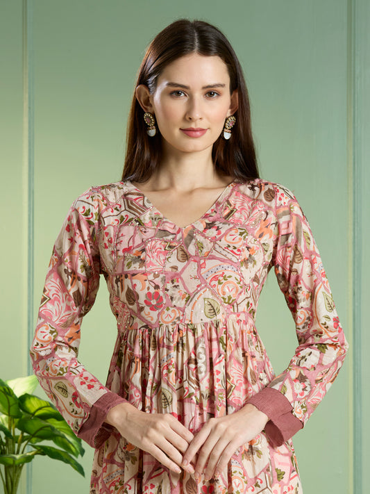 Abstract Floral Printed A-Line Pleated Kurta with...