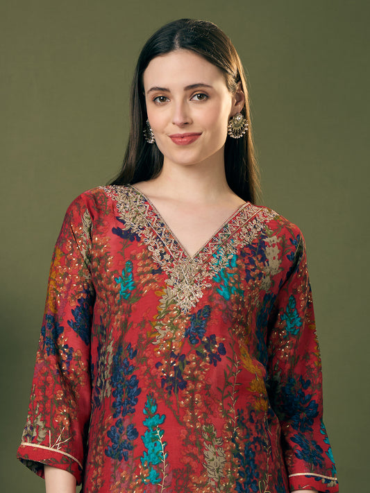 Ethnic Floral Printed Straight Fit Embroidered Kurta...