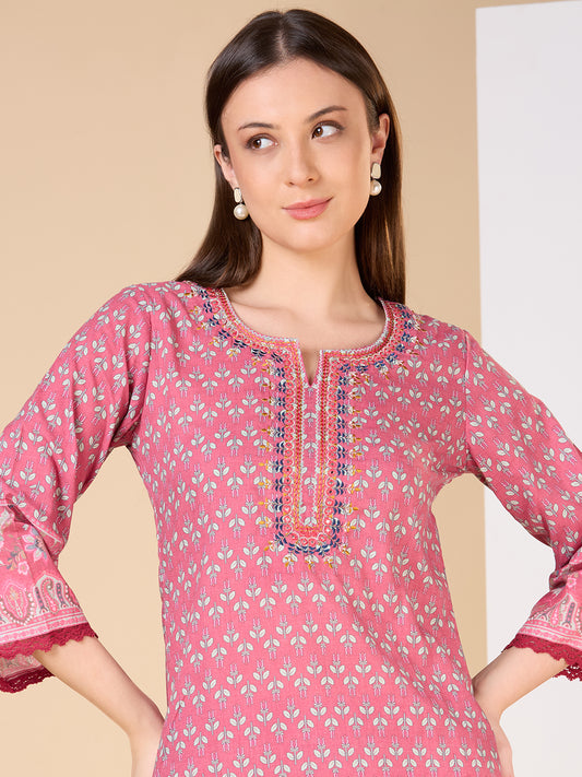 Ethnic Floral Printed & Embroidered Straight Fit...