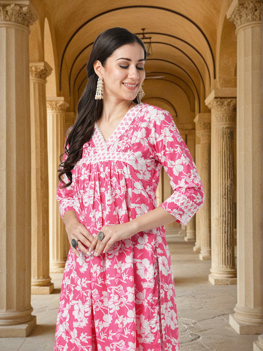 MRP (Inclusive of all taxes)Regular price ₹ 1,199.00₹ 1,199.00 Regular priceUnit price / per₹ 1,699.00Sale priceM L XL 2XL 3XL add to cartSale{"id":7588402069590,"title":"Floral Printed \u0026 Embroidered A-Line Pleated Kurta with Palazzo - Pink","handle":"floral-printed-embroidered-a-line-pleated-kurta-with-palazzo-pink","description":"\u003ch1\u003eHighlights\u003c\/h1\u003e\n\u003cp\u003e\u003cbr\u003e-Gracefully blending traditional charm with everyday ease, this A-line flared kurta set is a celebration of ethnic elegance. The kurta features all-over ethnic prints that add depth and vibrancy, while the angrakha-style front creates a classic, flattering silhouette. Delicate crochet lace details trace the neckline and wrap pattern, enhancing its refined finish. Designed in a soft, flowy fabric, the kurta pairs effortlessly with coordinated printed pants, offering both comfort and style for casual outings, festive moments, or workdays with a traditional twist.\u003c\/p\u003e\n\u003ch1\u003eFabric \u0026amp; Colour\u003c\/h1\u003e\n\u003cp\u003e\u003cbr\u003eTop Colour: Pink\u003cbr\u003eTop Fabric: Cotton\u003cbr\u003eBottom Colour: White\u003cbr\u003eBottom Fabric: Cotton Blend\u003c\/p\u003e\n\u003ch1\u003eSpecifications\u003c\/h1\u003e\n\u003cp\u003e\u003cbr\u003eTop Design: Floral print, Ethnic print\u003cbr\u003eTop Craft: Plain and Prints\u003cbr\u003eTop Shape: A-line\u003cbr\u003eNeck: V-Neck\u003cbr\u003eSleeve Length: Three-Quarter Sleeves\u003cbr\u003eTop Length: Calf Length\u003cbr\u003eHemline: Flared\u003cbr\u003e\u003c\/p\u003e\n\u003cp\u003eBottom Type: Trousers\u003cbr\u003eBottom Closure: Slip-On\u003cbr\u003eWaistband: Partially Elasticated\u003c\/p\u003e\n\u003cp\u003eWash Care: Hand Wash\u003c\/p\u003e\n\u003cp\u003eLength (in inches)\u003cbr\u003eKurta – 45, Sleeves – 17,\u003cbr\u003eBottom - 38\u003c\/p\u003e\n\u003cp\u003eModel’s Height: 5’7”. Wearing Size S.\u003c\/p\u003e\n\u003ch1\u003eProduct Information\u003c\/h1\u003e\n\u003cp\u003e\u003cbr\u003eManufactured\/Packed\/Marketed By:\u003cbr\u003eFashor Lifestyle Pvt. Ltd.\u003cbr\u003e28\/30, Sudarshanpura Industrial Area,\u003cbr\u003eJaipur - 302006.\u003cbr\u003eCountry of Origin: India\u003c\/p\u003e","published_at":"2025-07-11T14:17:43+05:30","created_at":"2025-07-11T13:43:51+05:30","vendor":"FASHOR","type":"2P Kurta Set","tags":["1001-2000","2XL","30569","3XL","All Styles","casualwear","colour_pink","craft_plain-and-prints","design_ethnic-print","design_floral-print","discount-zone","fabric_cotton","KURTI","kurtis","L","M","meta-size-chart-","now-trending","offer-zone","shape_a-line","workwear","XL"],"price":119900,"price_min":119900,"price_max":119900,"available":true,"price_varies":false,"compare_at_price":169900,"compare_at_price_min":169900,"compare_at_price_max":169900,"compare_at_price_varies":false,"variants":[{"id":42465486602326,"title":"M","option1":"M","option2":null,"option3":null,"sku":"38-KBB30569C5OS","requires_shipping":true,"taxable":false,"featured_image":{"id":34664368865366,"product_id":7588402069590,"position":5,"created_at":"2025-07-11T13:44:20+05:30","updated_at":"2025-07-11T13:44:49+05:30","alt":null,"width":1080,"height":1440,"src":"\/\/fashor.com\/cdn\/shop\/files\/30960_7.jpg?v=1752221689","variant_ids":[42465486602326,42465486635094,42465486667862,42465486700630,42465486733398]},"available":true,"name":"Floral Printed \u0026 Embroidered A-Line Pleated Kurta with Palazzo - Pink - M","public_title":"M","options":["M"],"price":119900,"weight":0,"compare_at_price":169900,"inventory_quantity":6,"inventory_management":"shopify","inventory_policy":"deny","barcode":"","featured_media":{"alt":null,"id":26935492575318,"position":5,"preview_image":{"aspect_ratio":0.75,"height":1440,"width":1080,"src":"\/\/fashor.com\/cdn\/shop\/files\/30960_7.jpg?v=1752221689"}},"requires_selling_plan":false,"selling_plan_allocations":[],"quantity_rule":{"min":1,"max":null,"increment":1}},{"id":42465486635094,"title":"L","option1":"L","option2":null,"option3":null,"sku":"40-KBB30569C5OS","requires_shipping":true,"taxable":false,"featured_image":{"id":34664368865366,"product_id":7588402069590,"position":5,"created_at":"2025-07-11T13:44:20+05:30","updated_at":"2025-07-11T13:44:49+05:30","alt":null,"width":1080,"height":1440,"src":"\/\/fashor.com\/cdn\/shop\/files\/30960_7.jpg?v=1752221689","variant_ids":[42465486602326,42465486635094,42465486667862,42465486700630,42465486733398]},"available":true,"name":"Floral Printed \u0026 Embroidered A-Line Pleated Kurta with Palazzo - Pink - L","public_title":"L","options":["L"],"price":119900,"weight":0,"compare_at_price":169900,"inventory_quantity":6,"inventory_management":"shopify","inventory_policy":"deny","barcode":"","featured_media":{"alt":null,"id":26935492575318,"position":5,"preview_image":{"aspect_ratio":0.75,"height":1440,"width":1080,"src":"\/\/fashor.com\/cdn\/shop\/files\/30960_7.jpg?v=1752221689"}},"requires_selling_plan":false,"selling_plan_allocations":[],"quantity_rule":{"min":1,"max":null,"increment":1}},{"id":42465486667862,"title":"XL","option1":"XL","option2":null,"option3":null,"sku":"42-KBB30569C5OS","requires_shipping":true,"taxable":false,"featured_image":{"id":34664368865366,"product_id":7588402069590,"position":5,"created_at":"2025-07-11T13:44:20+05:30","updated_at":"2025-07-11T13:44:49+05:30","alt":null,"width":1080,"height":1440,"src":"\/\/fashor.com\/cdn\/shop\/files\/30960_7.jpg?v=1752221689","variant_ids":[42465486602326,42465486635094,42465486667862,42465486700630,42465486733398]},"available":true,"name":"Floral Printed \u0026 Embroidered A-Line Pleated Kurta with Palazzo - Pink - XL","public_title":"XL","options":["XL"],"price":119900,"weight":0,"compare_at_price":169900,"inventory_quantity":5,"inventory_management":"shopify","inventory_policy":"deny","barcode":"","featured_media":{"alt":null,"id":26935492575318,"position":5,"preview_image":{"aspect_ratio":0.75,"height":1440,"width":1080,"src":"\/\/fashor.com\/cdn\/