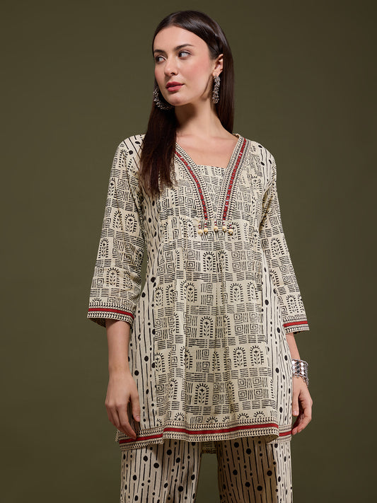 MRP (Inclusive of all taxes)Regular price ₹ 1,799.00₹ 1,799.00 Regular priceUnit price / per₹ 1,999.00Sale priceM L XL 2XL add to cartSale{"id":7582086168662,"title":"Ethnic Tribal Printed \u0026 Embroidered A-Line Paneled Kurta with Palazzo - Off White","handle":"ethnic-tribal-printed-embroidered-a-line-paneled-kurta-with-palazzo-off-white","description":"\u003ch1\u003eHighlights\u003cbr\u003e\n\u003c\/h1\u003e\n\u003cp\u003e\u003cbr\u003e-Step into effortless elegance with this Off-White Ethnic Tribal Kurta set. Crafted in breathable cotton, the A-line paneled kurta features a flattering V-neckline adorned with intricate mirror work embroidery, beautifully offset by vibrant tribal prints. Paired with a matching palazzo, this ensemble blends tradition and contemporary charm—perfect for festive days or elevated everyday style.\u003c\/p\u003e\n\u003ch1\u003eFabric \u0026amp; Colour\u003c\/h1\u003e\n\u003cp\u003e\u003cbr\u003eTop Colour: Off White\u003cbr\u003eTop Fabric: Cotton\u003cbr\u003eBottom Colour: Off White\u003cbr\u003eBottom Fabric: Cotton Blend\u003c\/p\u003e\n\u003ch1\u003eSpecifications\u003c\/h1\u003e\n\u003cp\u003e\u003cbr\u003eTop Design: Ethnic print\u003cbr\u003eTop Craft: Mirror work, Plain and Prints\u003cbr\u003eTop Shape: A-line\u003cbr\u003eNeck: V-Neck\u003cbr\u003eSleeve Length: Three-Quarter Sleeves\u003cbr\u003eTop Length: Above Knee\u003cbr\u003eHemline: Flared\u003cbr\u003e\u003c\/p\u003e\n\u003cp\u003eBottom Type: Palazzos\u003cbr\u003eBottom Closure: Slip-On\u003cbr\u003eWaistband: Elasticated\u003c\/p\u003e\n\u003cp\u003eWash Care: Hand Wash\u003c\/p\u003e\n\u003cp\u003eLength (in inches)\u003cbr\u003eKurta – 33, Sleeves – 17,\u003cbr\u003eBottom - 38\u003c\/p\u003e\n\u003cp\u003eModel’s Height: 5’7”. Wearing Size S.\u003c\/p\u003e\n\u003ch1\u003eProduct Information\u003c\/h1\u003e\n\u003cp\u003e\u003cbr\u003eManufactured\/Packed\/Marketed By:\u003cbr\u003eFashor Lifestyle Pvt. Ltd.\u003cbr\u003e28\/30, Sudarshanpura Industrial Area,\u003cbr\u003eJaipur - 302006.\u003cbr\u003eCountry of Origin: India\u003c\/p\u003e","published_at":"2025-06-26T15:38:59+05:30","created_at":"2025-06-26T12:40:46+05:30","vendor":"FASHOR","type":"2P Kurta Set","tags":["1001-2000","28152","2XL","All Styles","casualwear","colour_white","craft_mirror-work","craft_plain-and-prints","design_ethnic-print","discount-zone","fabric_cotton","KURTI","kurtis","L","M","meta-size-chart-","now-trending","offer-zone","shape_a-line","workwear","XL"],"price":179900,"price_min":179900,"price_max":179900,"available":true,"price_varies":false,"compare_at_price":199900,"compare_at_price_min":199900,"compare_at_price_max":199900,"compare_at_price_varies":false,"variants":[{"id":42424854839382,"title":"M","option1":"M","option2":null,"option3":null,"sku":"38-KB028152A5OS","requires_shipping":true,"taxable":false,"featured_image":{"id":34615141728342,"product_id":7582086168662,"position":5,"created_at":"2025-06-26T12:43:49+05:30","updated_at":"2025-06-26T12:44:18+05:30","alt":null,"width":1080,"height":1440,"src":"\/\/fashor.com\/cdn\/shop\/files\/31284_6.jpg?v=1750922058","variant_ids":[42424854839382,42424854872150,42424854904918,42424854937686]},"available":true,"name":"Ethnic Tribal Printed \u0026 Embroidered A-Line Paneled Kurta with Palazzo - Off White - M","public_title":"M","options":["M"],"price":179900,"weight":0,"compare_at_price":199900,"inventory_quantity":5,"inventory_management":"shopify","inventory_policy":"deny","barcode":"","featured_media":{"alt":null,"id":26899030605910,"position":5,"preview_image":{"aspect_ratio":0.75,"height":1440,"width":1080,"src":"\/\/fashor.com\/cdn\/shop\/files\/31284_6.jpg?v=1750922058"}},"requires_selling_plan":false,"selling_plan_allocations":[],"quantity_rule":{"min":1,"max":null,"increment":1}},{"id":42424854872150,"title":"L","option1":"L","option2":null,"option3":null,"sku":"40-KB028152A5OS","requires_shipping":true,"taxable":false,"featured_image":{"id":34615141728342,"product_id":7582086168662,"position":5,"created_at":"2025-06-26T12:43:49+05:30","updated_at":"2025-06-26T12:44:18+05:30","alt":null,"width":1080,"height":1440,"src":"\/\/fashor.com\/cdn\/shop\/files\/31284_6.jpg?v=1750922058","variant_ids":[42424854839382,42424854872150,42424854904918,42424854937686]},"available":true,"name":"Ethnic Tribal Printed \u0026 Embroidered A-Line Paneled Kurta with Palazzo - Off White - L","public_title":"L","options":["L"],"price":179900,"weight":0,"compare_at_price":199900,"inventory_quantity":5,"inventory_management":"shopify","inventory_policy":"deny","barcode":"","featured_media":{"alt":null,"id":26899030605910,"position":5,"preview_image":{"aspect_ratio":0.75,"height":1440,"width":1080,"src":"\/\/fashor.com\/cdn\/shop\/files\/31284_6.jpg?v=1750922058"}},"requires_selling_plan":false,"selling_plan_allocations":[],"quantity_rule":{"min":1,"max":null,"increment":1}},{"id":42424854904918,"title":"XL","option1":"XL","option2":null,"option3":null,"sku":"42-KB028152A5OS","requires_shipping":true,"taxable":false,"featured_image":{"id":34615141728342,"product_id":7582086168662,"position":5,"created_at":"2025-06-26T12:43:49+05:30","updated_at":"2025-06-26T12:44:18+05:30","alt":null,"width":1080,"height":1440,"src":"\/\/fashor.com\/cdn\/shop\/files\/31284_6.jpg?v=1750922058","variant_ids":[42424854839382,42424854872150,42424854904918,42424854937686]},"available":true,"name":"Ethnic Tribal Printed \u0026 Embroidered A-Line Paneled Kurta with Palazzo - Off White - XL","public_title":"XL","options":["XL"],"price":179900,"weight":0,"compare_at_price":199900,"inventory_quantity":5,"inventory_management":"shopify","inventory_policy":"deny","barcode":"","featured_media":{"alt":null,"id":26899030605910,"position":5,"preview_image":{"aspect_ratio":0.75,"height":1440,"width":1080,"src":"\/\/fashor.com\/cdn\/shop\/files\/31284_6.jpg?v=1750922058"}},"requires_selling_plan":false,"selling_plan_allocations":[],"quantity_rule":{"min":1,"max":null,"increment":1}},{