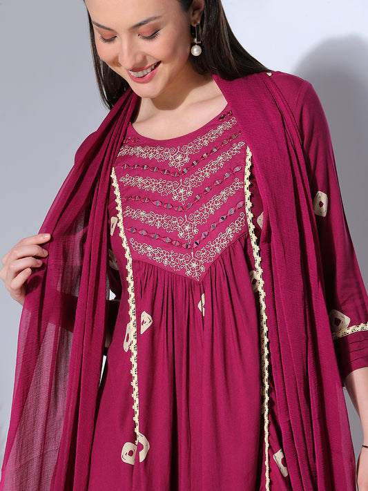Solid Ethnic Embroidered A-Line Kurta with Pant...