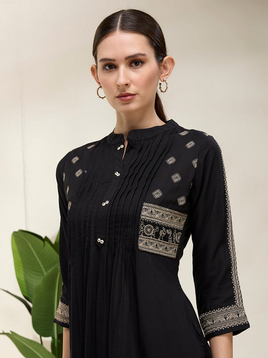 MRP (Inclusive of all taxes)Regular price ₹ 1,349.00₹ 1,349.00 Regular priceUnit price / per₹ 4,799.00Sale priceM L XL 2XL 3XL add to cartSale{"id":7683160211542,"title":"Solid Floral Threadwork Embroidered A-Line Kurta with Pant - Black","handle":"solid-floral-threadwork-embroidered-a-line-kurta-with-pant-black","description":"\u003ch1\u003eHighlights\u003c\/h1\u003e\n\u003cp\u003e\u003cbr\u003e\u003cbr\u003e-Elevate your ethnic wardrobe with this elegant Solid Floral Zari Embroidered A-Line Kurta Set in a regal Black hue. Crafted from a luxurious silk blend, the kurta features a classic round neckline, delicate pintucks on the yoke, and intricate floral Threadwork embroidery that adds a touch of festive shimmer. Paired with matching pants for a seamless look, this ensemble is perfect for celebrations, evening gatherings, or festive occasions.\u003c\/p\u003e\n\u003ch1\u003e\n\u003cbr\u003eFabric \u0026amp; Colour\u003c\/h1\u003e\n\u003cp\u003e\u003cbr\u003eTop Colour: Black\u003cbr\u003eTop Fabric: Viscose Rayon\u003cbr\u003eBottom Colour: Black\u003cbr\u003eBottom Fabric: Viscose Rayon\u003c\/p\u003e\n\u003ch1\u003eSpecifications\u003c\/h1\u003e\n\u003cp\u003e\u003cbr\u003eTop Design: Solid\u003cbr\u003eTop Craft: Embroidery, Plain and Prints\u003cbr\u003eTop Shape: A-line\u003cbr\u003eNeck: Round Neck\u003cbr\u003eSleeve Length: Three-Quarter Sleeves\u003cbr\u003eTop Length: Calf Length\u003cbr\u003eHemline: Flared\u003cbr\u003eSlit: Side Slits\u003c\/p\u003e\n\u003cp\u003eBottom Type: Trousers\u003cbr\u003eBottom Closure: Slip-On\u003cbr\u003eWaistband: Elasticated\u003c\/p\u003e\n\u003cp\u003eWash Care: Hand Wash\u003c\/p\u003e\n\u003cp\u003eLength (in inches)\u003cbr\u003eKurta – 35, Sleeves – 17,\u003cbr\u003eBottom - 38\u003c\/p\u003e\n\u003cp\u003eModel’s Height: 5’7”. Wearing Size S.\u003c\/p\u003e\n\u003ch1\u003eProduct Information\u003c\/h1\u003e\n\u003cp\u003e\u003cbr\u003eManufactured\/Packed\/Marketed By:\u003cbr\u003eFashor Lifestyle Pvt. Ltd.\u003cbr\u003e28\/30, Sudarshanpura Industrial Area,\u003cbr\u003eJaipur - 302006.\u003cbr\u003eCountry of Origin: India\u003c\/p\u003e","published_at":"2025-10-23T18:42:30+05:30","created_at":"2025-10-23T12:15:13+05:30","vendor":"FASHOR","type":"2P Kurta Set","tags":["1001-2000","2XL","31914","3XL","All Styles","casualwear","colour_black","craft_embroidery","craft_plain-and-prints","design_solid","discount-zone","fabric_viscose-rayon","KURTI","kurtis","L","M","meta-size-chart-","now-trending","offer-zone","shape_a-line","XL"],"price":134900,"price_min":134900,"price_max":134900,"available":true,"price_varies":false,"compare_at_price":479900,"compare_at_price_min":479900,"compare_at_price_max":479900,"compare_at_price_varies":false,"variants":[{"id":43502639644758,"title":"M","option1":"M","option2":null,"option3":null,"sku":"38-KBA31914G5FS","requires_shipping":true,"taxable":false,"featured_image":{"id":35437083426902,"product_id":7683160211542,"position":1,"created_at":"2025-10-23T18:29:18+05:30","updated_at":"2025-10-23T18:29:20+05:30","alt":null,"width":1080,"height":1440,"src":"\/\/fashor.com\/cdn\/shop\/files\/32526_1.jpg?v=1761224360","variant_ids":[43502639644758,43502639677526,43502639710294,43502639743062,43502639775830]},"available":true,"name":"Solid Floral Threadwork Embroidered A-Line Kurta with Pant - Black - M","public_title":"M","options":["M"],"price":134900,"weight":0,"compare_at_price":479900,"inventory_quantity":6,"inventory_management":"shopify","inventory_policy":"deny","barcode":"","featured_media":{"alt":null,"id":27542123348054,"position":1,"preview_image":{"aspect_ratio":0.75,"height":1440,"width":1080,"src":"\/\/fashor.com\/cdn\/shop\/files\/32526_1.jpg?v=1761224360"}},"requires_selling_plan":false,"selling_plan_allocations":[],"quantity_rule":{"min":1,"max":null,"increment":1}},{"id":43502639677526,"title":"L","option1":"L","option2":null,"option3":null,"sku":"40-KBA31914G5FS","requires_shipping":true,"taxable":false,"featured_image":{"id":35437083426902,"product_id":7683160211542,"position":1,"created_at":"2025-10-23T18:29:18+05:30","updated_at":"2025-10-23T18:29:20+05:30","alt":null,"width":1080,"height":1440,"src":"\/\/fashor.com\/cdn\/shop\/files\/32526_1.jpg?v=1761224360","variant_ids":[43502639644758,43502639677526,43502639710294,43502639743062,43502639775830]},"available":true,"name":"Solid Floral Threadwork Embroidered A-Line Kurta with Pant - Black - L","public_title":"L","options":["L"],"price":134900,"weight":0,"compare_at_price":479900,"inventory_quantity":8,"inventory_management":"shopify","inventory_policy":"deny","barcode":"","featured_media":{"alt":null,"id":27542123348054,"position":1,"preview_image":{"aspect_ratio":0.75,"height":1440,"width":1080,"src":"\/\/fashor.com\/cdn\/shop\/files\/32526_1.jpg?v=1761224360"}},"requires_selling_plan":false,"selling_plan_allocations":[],"quantity_rule":{"min":1,"max":null,"increment":1}},{"id":43502639710294,"title":"XL","option1":"XL","option2":null,"option3":null,"sku":"42-KBA31914G5FS","requires_shipping":true,"taxable":false,"featured_image":{"id":35437083426902,"product_id":7683160211542,"position":1,"created_at":"2025-10-23T18:29:18+05:30","updated_at":"2025-10-23T18:29:20+05:30","alt":null,"width":1080,"height":1440,"src":"\/\/fashor.com\/cdn\/shop\/files\/32526_1.jpg?v=1761224360","variant_ids":[43502639644758,43502639677526,43502639710294,43502639743062,43502639775830]},"available":true,"name":"Solid Floral Threadwork Embroidered A-Line Kurta with Pant - Black - XL","public_title":"XL","options":["XL"],"price":134900,"weight":0,"compare_at_price":479900,"inventory_quantity":7,"inventory_management":"shopify","inventory_policy":"deny","barcode":"","featured_media":{"alt":null,"id":27542123348054,"position":1,"preview_image":{"aspect_ratio":0.75,"height":1440,"width":1080,"src":"\/\/fashor.com\/cdn\/shop\/files\/32526_1.jpg?v=1761224360"}},"requires_selling_plan":false,"selling_plan_allocations":[],"quantity_rule":{"min":1,"max