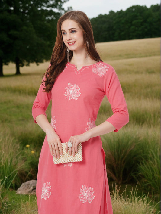 Solid Floral Threadwork Embroidered Straight Fit Kurti...