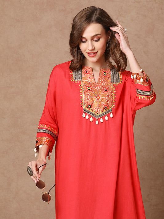 Abstract Floral Embroidered One Shoulder Kaftan Kurta...