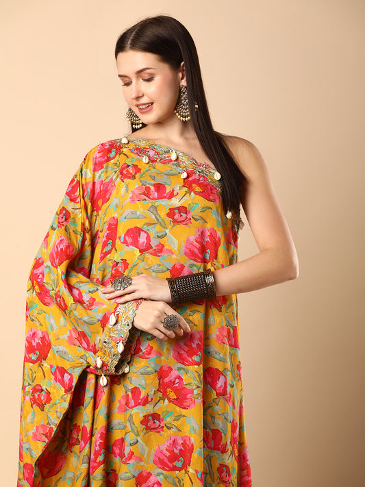 Abstract Floral Embroidered One Shoulder Kaftan Kurta...