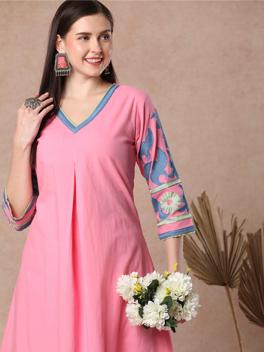 Solid Cross Stitch Embroidered A-Line Kurta with...