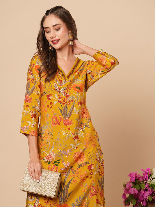 Ethnic Floral Printed & Embroidered Straight Fit...