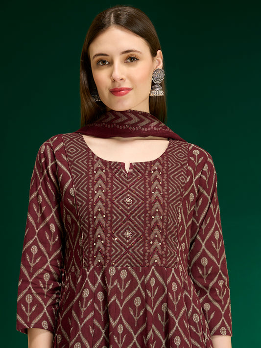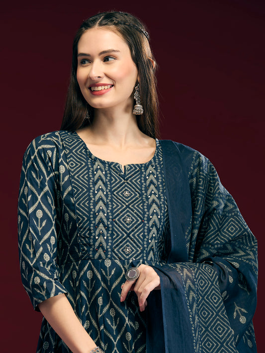 Ethnic Floral Printed Embroidered Anarkali Kurta with...