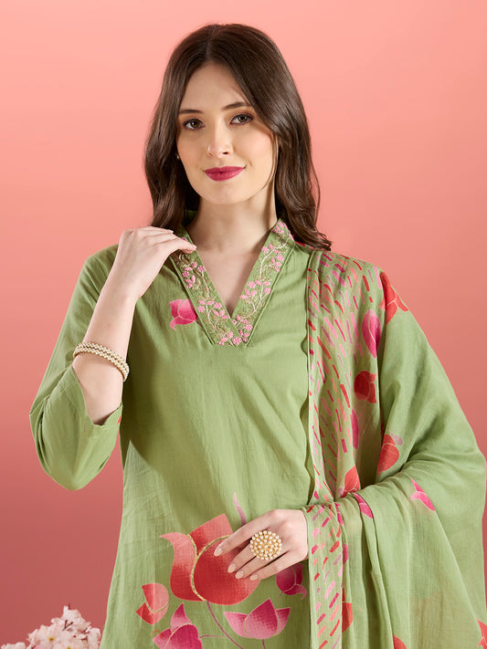 MRP (Inclusive of all taxes)Regular price ₹ 2,999.00₹ 2,999.00 Regular priceUnit price / per₹ 2,999.00Sale priceS M L XL 2XL add to cart{"id":7713999224918,"title":"Ethnic Lotus Printed \u0026 Embroidered Straight Kurta with Pant \u0026 Dupatta - Green","handle":"ethnic-lotus-printed-embroidered-straight-kurta-with-pant-dupatta-green","description":"\u003ch1\u003eHighlights\u003c\/h1\u003e\n\u003cp\u003e\u003cbr\u003e\u003cbr\u003e-This straight fit kurta with ethnic lotus prints at front along with thread embroidered work, paired with solid bottom and printed complementing dupatta, this style is perfect for everyday wear.\u003c\/p\u003e\n\u003ch1\u003e\n\u003cbr\u003eFabric \u0026amp; Colour\u003c\/h1\u003e\n\u003cp\u003e\u003cbr\u003eTop Colour: Green\u003cbr\u003eTop Fabric: Cotton\u003cbr\u003eBottom Colour: Green\u003cbr\u003eBottom Fabric: Cotton Blend\u003cbr\u003eDupatta Colour: Green\u003cbr\u003eDupatta Fabric: Pure Cotton\u003c\/p\u003e\n\u003ch1\u003eSpecifications\u003c\/h1\u003e\n\u003cp\u003e\u003cbr\u003eTop Design: Floral print, Ethnic print\u003cbr\u003eTop Craft: Zari, Embroidery, Plain and Prints\u003cbr\u003eTop Shape: Straight\u003cbr\u003eNeck: Shawl Collar\u003cbr\u003eSleeve Length: Three-Quarter Sleeves\u003cbr\u003eTop Length: Knee Length\u003cbr\u003eHemline: Straight\u003cbr\u003eSlit: Side Slits\u003c\/p\u003e\n\u003cp\u003eBottom Type: Trousers\u003cbr\u003eBottom Closure: Slip-On\u003cbr\u003eWaistband: Partially Elasticated\u003c\/p\u003e\n\u003cp\u003eDupatta Pattern: Printed\u003cbr\u003eDupatta Border: Printed\u003c\/p\u003e\n\u003cp\u003eWash Care: Hand Wash\u003c\/p\u003e\n\u003cp\u003eLength (in inches)\u003cbr\u003eKurta – 46, Sleeves – 17,\u003cbr\u003eBottom – 44\u003c\/p\u003e\n\u003cp\u003eModel’s Height: 5’7”. Wearing Size S.\u003c\/p\u003e\n\u003ch1\u003eProduct Information\u003c\/h1\u003e\n\u003cp\u003e\u003cbr\u003eManufactured\/Packed\/Marketed By:\u003cbr\u003eFashor Lifestyle Pvt. Ltd.\u003cbr\u003e28\/30, Sudarshanpura Industrial Area,\u003cbr\u003eJaipur - 302006.\u003cbr\u003eCountry of Origin: India\u003c\/p\u003e","published_at":"2025-11-26T12:28:01+05:30","created_at":"2025-11-20T17:32:25+05:30","vendor":"FASHOR","type":"3P Kurta Set","tags":["2001-3000","27577","2XL","All Styles","casualwear","colour_Green","craft_embroidery","craft_plain-and-prints","craft_zari","design_ethnic-print","design_floral-print","fabric_cotton","KURTI","kurtis","L","M","meta-size-chart-","now-trending","S","shape_straight","XL"],"price":299900,"price_min":299900,"price_max":299900,"available":true,"price_varies":false,"compare_at_price":299900,"compare_at_price_min":299900,"compare_at_price_max":299900,"compare_at_price_varies":false,"variants":[{"id":43660543819862,"title":"S","option1":"S","option2":null,"option3":null,"sku":"36-ST027577L4OS","requires_shipping":true,"taxable":true,"featured_image":{"id":35684008394838,"product_id":7713999224918,"position":1,"created_at":"2025-11-20T17:33:03+05:30","updated_at":"2025-11-20T17:33:05+05:30","alt":null,"width":1080,"height":1440,"src":"\/\/fashor.com\/cdn\/shop\/files\/32792_1.jpg?v=1763640185","variant_ids":[43660543819862,43660543852630,43660543885398,43660543918166,43660543950934]},"available":true,"name":"Ethnic Lotus Printed \u0026 Embroidered Straight Kurta with Pant \u0026 Dupatta - Green - S","public_title":"S","options":["S"],"price":299900,"weight":0,"compare_at_price":299900,"inventory_quantity":13,"inventory_management":"shopify","inventory_policy":"deny","barcode":"","featured_media":{"alt":null,"id":27767415996502,"position":1,"preview_image":{"aspect_ratio":0.75,"height":1440,"width":1080,"src":"\/\/fashor.com\/cdn\/shop\/files\/32792_1.jpg?v=1763640185"}},"requires_selling_plan":false,"selling_plan_allocations":[],"quantity_rule":{"min":1,"max":null,"increment":1}},{"id":43660543852630,"title":"M","option1":"M","option2":null,"option3":null,"sku":"38-ST027577L4OS","requires_shipping":true,"taxable":true,"featured_image":{"id":35684008394838,"product_id":7713999224918,"position":1,"created_at":"2025-11-20T17:33:03+05:30","updated_at":"2025-11-20T17:33:05+05:30","alt":null,"width":1080,"height":1440,"src":"\/\/fashor.com\/cdn\/shop\/files\/32792_1.jpg?v=1763640185","variant_ids":[43660543819862,43660543852630,43660543885398,43660543918166,43660543950934]},"available":true,"name":"Ethnic Lotus Printed \u0026 Embroidered Straight Kurta with Pant \u0026 Dupatta - Green - M","public_title":"M","options":["M"],"price":299900,"weight":0,"compare_at_price":299900,"inventory_quantity":7,"inventory_management":"shopify","inventory_policy":"deny","barcode":"","featured_media":{"alt":null,"id":27767415996502,"position":1,"preview_image":{"aspect_ratio":0.75,"height":1440,"width":1080,"src":"\/\/fashor.com\/cdn\/shop\/files\/32792_1.jpg?v=1763640185"}},"requires_selling_plan":false,"selling_plan_allocations":[],"quantity_rule":{"min":1,"max":null,"increment":1}},{"id":43660543885398,"title":"L","option1":"L","option2":null,"option3":null,"sku":"40-ST027577L4OS","requires_shipping":true,"taxable":true,"featured_image":{"id":35684008394838,"product_id":7713999224918,"position":1,"created_at":"2025-11-20T17:33:03+05:30","updated_at":"2025-11-20T17:33:05+05:30","alt":null,"width":1080,"height":1440,"src":"\/\/fashor.com\/cdn\/shop\/files\/32792_1.jpg?v=1763640185","variant_ids":[43660543819862,43660543852630,43660543885398,43660543918166,43660543950934]},"available":true,"name":"Ethnic Lotus Printed \u0026 Embroidered Straight Kurta with Pant \u0026 Dupatta - Green - L","public_title":"L","options":["L"],"price":299900,"weight":0,"compare_at_price":299900,"inventory_quantity":5,"inventory_management":"shopify","inventory_policy":"deny","barcode":"","featured_media":{"alt":null,"id":27767415996502,"position":1,"preview_image":{"aspect_ratio":0.75,"height":1440,"width":1080,"src":"\/\/fashor.com\/cdn\/shop\/files\/32792_1.jpg?v=1763640185"}},"requires_selling_plan":false,"selling_plan_alloc