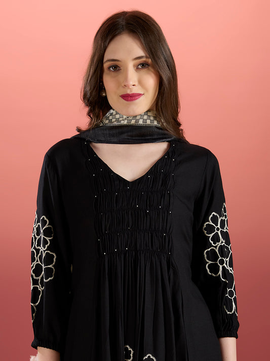 MRP (Inclusive of all taxes)Regular price ₹ 2,349.00₹ 2,349.00 Regular priceUnit price / per₹ 5,899.00Sale priceM L XL 2XL 3XL add to cartSale{"id":7713896431702,"title":"Floral Embroidered A-Line Pleated Kurta with Palazzo \u0026 Dupatta - Black","handle":"floral-embroidered-a-line-pleated-kurta-with-palazzo-dupatta-black","description":"\u003ch1\u003eHighlights\u003cbr\u003e\n\u003c\/h1\u003e\n\u003cp\u003e\u003cbr\u003e-Featuring pin tucks at front yoke, a v neckline with subtle Floral Embroidery highlights, and paired with a solid palazzo, this ensemble is completed with a Chanderi floral embroidered dupatta—perfect for festive days and elegant daytime outings.\u003c\/p\u003e\n\u003ch1\u003e\n\u003cbr\u003eFabric \u0026amp; Colour\u003c\/h1\u003e\n\u003cp\u003e\u003cbr\u003eTop Colour: Black\u003cbr\u003eTop Fabric: Viscose Rayon\u003cbr\u003eBottom Colour: Black\u003cbr\u003eBottom Fabric: Viscose Rayon\u003cbr\u003eDupatta Colour: Cream\u003cbr\u003eDupatta Fabric: Chanderi\u003c\/p\u003e\n\u003ch1\u003eSpecifications\u003c\/h1\u003e\n\u003cp\u003e\u003cbr\u003eTop Design: Solid\u003cbr\u003eTop Craft: Embroidery, Plain and Prints\u003cbr\u003eTop Shape: A-line\u003cbr\u003eNeck: V Neck\u003cbr\u003eSleeve Length: Three-Quarter Sleeves\u003cbr\u003eTop Length: Calf Length\u003cbr\u003eHemline: Flared\u003cbr\u003e\u003c\/p\u003e\n\u003cp\u003eBottom Type: Palazzos\u003cbr\u003eBottom Closure: Slip-On\u003cbr\u003eWaistband: Elasticated\u003c\/p\u003e\n\u003cp\u003eDupatta Pattern: Printed\u003cbr\u003eDupatta Border: Tassels\u003c\/p\u003e\n\u003cp\u003eWash Care: Hand Wash\u003c\/p\u003e\n\u003cp\u003eLength (in inches)\u003cbr\u003eKurta – 45, Sleeves – 17,\u003cbr\u003eBottom – 40\u003c\/p\u003e\n\u003cp\u003eModel’s Height: 5’7”. Wearing Size S.\u003c\/p\u003e\n\u003ch1\u003eProduct Information\u003c\/h1\u003e\n\u003cp\u003e\u003cbr\u003eManufactured\/Packed\/Marketed By:\u003cbr\u003eFashor Lifestyle Pvt. Ltd.\u003cbr\u003e28\/30, Sudarshanpura Industrial Area,\u003cbr\u003eJaipur - 302006.\u003cbr\u003eCountry of Origin: India\u003c\/p\u003e","published_at":"2025-11-20T14:28:49+05:30","created_at":"2025-11-20T12:53:28+05:30","vendor":"FASHOR","type":"3P Kurta Set","tags":["2001-3000","2XL","32827","3XL","All Styles","casualwear","colour_black","craft_embroidery","craft_plain-and-prints","design_solid","fabric_viscose-rayon","KURTI","kurtis","L","M","meta-size-chart-","now-trending","shape_a-line","XL"],"price":234900,"price_min":234900,"price_max":234900,"available":true,"price_varies":false,"compare_at_price":589900,"compare_at_price_min":589900,"compare_at_price_max":589900,"compare_at_price_varies":false,"variants":[{"id":43660148473942,"title":"M","option1":"M","option2":null,"option3":null,"sku":"38-STA32827I5FS","requires_shipping":true,"taxable":true,"featured_image":{"id":35683234971734,"product_id":7713896431702,"position":1,"created_at":"2025-11-20T12:54:13+05:30","updated_at":"2025-11-20T12:54:14+05:30","alt":null,"width":1080,"height":1440,"src":"\/\/fashor.com\/cdn\/shop\/files\/32802_1.jpg?v=1763623454","variant_ids":[43660148473942,43660148506710,43660148539478,43660148572246,43660148605014]},"available":true,"name":"Floral Embroidered A-Line Pleated Kurta with Palazzo \u0026 Dupatta - Black - M","public_title":"M","options":["M"],"price":234900,"weight":0,"compare_at_price":589900,"inventory_quantity":5,"inventory_management":"shopify","inventory_policy":"deny","barcode":"","featured_media":{"alt":null,"id":27766708306006,"position":1,"preview_image":{"aspect_ratio":0.75,"height":1440,"width":1080,"src":"\/\/fashor.com\/cdn\/shop\/files\/32802_1.jpg?v=1763623454"}},"requires_selling_plan":false,"selling_plan_allocations":[],"quantity_rule":{"min":1,"max":null,"increment":1}},{"id":43660148506710,"title":"L","option1":"L","option2":null,"option3":null,"sku":"40-STA32827I5FS","requires_shipping":true,"taxable":true,"featured_image":{"id":35683234971734,"product_id":7713896431702,"position":1,"created_at":"2025-11-20T12:54:13+05:30","updated_at":"2025-11-20T12:54:14+05:30","alt":null,"width":1080,"height":1440,"src":"\/\/fashor.com\/cdn\/shop\/files\/32802_1.jpg?v=1763623454","variant_ids":[43660148473942,43660148506710,43660148539478,43660148572246,43660148605014]},"available":true,"name":"Floral Embroidered A-Line Pleated Kurta with Palazzo \u0026 Dupatta - Black - L","public_title":"L","options":["L"],"price":234900,"weight":0,"compare_at_price":589900,"inventory_quantity":6,"inventory_management":"shopify","inventory_policy":"deny","barcode":"","featured_media":{"alt":null,"id":27766708306006,"position":1,"preview_image":{"aspect_ratio":0.75,"height":1440,"width":1080,"src":"\/\/fashor.com\/cdn\/shop\/files\/32802_1.jpg?v=1763623454"}},"requires_selling_plan":false,"selling_plan_allocations":[],"quantity_rule":{"min":1,"max":null,"increment":1}},{"id":43660148539478,"title":"XL","option1":"XL","option2":null,"option3":null,"sku":"42-STA32827I5FS","requires_shipping":true,"taxable":true,"featured_image":{"id":35683234971734,"product_id":7713896431702,"position":1,"created_at":"2025-11-20T12:54:13+05:30","updated_at":"2025-11-20T12:54:14+05:30","alt":null,"width":1080,"height":1440,"src":"\/\/fashor.com\/cdn\/shop\/files\/32802_1.jpg?v=1763623454","variant_ids":[43660148473942,43660148506710,43660148539478,43660148572246,43660148605014]},"available":true,"name":"Floral Embroidered A-Line Pleated Kurta with Palazzo \u0026 Dupatta - Black - XL","public_title":"XL","options":["XL"],"price":234900,"weight":0,"compare_at_price":589900,"inventory_quantity":5,"inventory_management":"shopify","inventory_policy":"deny","barcode":"","featured_media":{"alt":null,"id":27766708306006,"position":1,"preview_image":{"aspect_ratio":0.75,"height":1440,"width":1080,"src":"\/\/fashor.com\/cdn\/shop\/files\/32802_1.jpg?v=1763623454"}},"requires_selling_plan":false,"selling_plan_allocations":[],"quantity_rule":{"min":1,"max":null,"increment":1}},{"id":43660148572