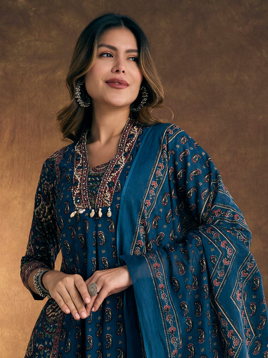 Ethnic Floral Printed Embroidered A-Line Kurta with...