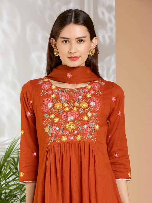 Solid Floral Embroidered A-Line Flared Kurta with...