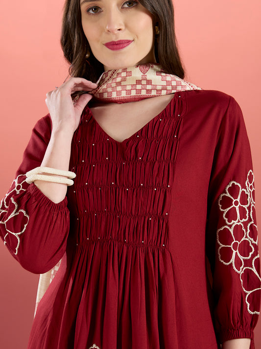 MRP (Inclusive of all taxes)Regular price ₹ 2,349.00₹ 2,349.00 Regular priceUnit price / per₹ 5,899.00Sale priceM L XL 2XL 3XL add to cartSale{"id":7713896923222,"title":"Floral Embroidered A-Line Pleated Kurta with Palazzo \u0026 Dupatta - Maroon","handle":"floral-embroidered-a-line-pleated-kurta-with-palazzo-dupatta-maroon","description":"\u003ch1\u003eHighlights\u003c\/h1\u003e\n\u003cp\u003e\u003cbr\u003e\u003cbr\u003e-Featuring pin tucks at front yoke, a v neckline with subtle Floral Embroidery highlights, and paired with a solid palazzo, this ensemble is completed with a Chanderi floral embroidered dupatta—perfect for festive days and elegant daytime outings.\u003c\/p\u003e\n\u003ch1\u003e\n\u003cbr\u003eFabric \u0026amp; Colour\u003c\/h1\u003e\n\u003cp\u003e\u003cbr\u003eTop Colour: Maroon\u003cbr\u003eTop Fabric: Viscose Rayon\u003cbr\u003eBottom Colour: Maroon\u003cbr\u003eBottom Fabric: Viscose Rayon\u003cbr\u003eDupatta Colour: Cream\u003cbr\u003eDupatta Fabric: Chanderi\u003c\/p\u003e\n\u003ch1\u003eSpecifications\u003c\/h1\u003e\n\u003cp\u003e\u003cbr\u003eTop Design: Solid\u003cbr\u003eTop Craft: Embroidery, Plain and Prints\u003cbr\u003eTop Shape: A-line\u003cbr\u003eNeck: V Neck\u003cbr\u003eSleeve Length: Three-Quarter Sleeves\u003cbr\u003eTop Length: Calf Length\u003cbr\u003eHemline: Flared\u003cbr\u003e\u003c\/p\u003e\n\u003cp\u003eBottom Type: Palazzos\u003cbr\u003eBottom Closure: Slip-On\u003cbr\u003eWaistband: Elasticated\u003c\/p\u003e\n\u003cp\u003eDupatta Pattern: Printed\u003cbr\u003eDupatta Border: Tassels\u003c\/p\u003e\n\u003cp\u003eWash Care: Hand Wash\u003c\/p\u003e\n\u003cp\u003eLength (in inches)\u003cbr\u003eKurta – 45, Sleeves – 17,\u003cbr\u003eBottom – 38\u003c\/p\u003e\n\u003cp\u003eModel’s Height: 5’7”. Wearing Size S.\u003c\/p\u003e\n\u003ch1\u003eProduct Information\u003c\/h1\u003e\n\u003cp\u003e\u003cbr\u003eManufactured\/Packed\/Marketed By:\u003cbr\u003eFashor Lifestyle Pvt. Ltd.\u003cbr\u003e28\/30, Sudarshanpura Industrial Area,\u003cbr\u003eJaipur - 302006.\u003cbr\u003eCountry of Origin: India\u003c\/p\u003e","published_at":"2025-11-20T14:29:35+05:30","created_at":"2025-11-20T12:58:53+05:30","vendor":"FASHOR","type":"3P Kurta Set","tags":["2001-3000","2XL","32828","3XL","All Styles","casualwear","colour_maroon","craft_embroidery","craft_plain-and-prints","design_solid","fabric_viscose-rayon","KURTI","kurtis","L","M","meta-size-chart-","now-trending","shape_a-line","XL"],"price":234900,"price_min":234900,"price_max":234900,"available":true,"price_varies":false,"compare_at_price":589900,"compare_at_price_min":589900,"compare_at_price_max":589900,"compare_at_price_varies":false,"variants":[{"id":43660151849046,"title":"M","option1":"M","option2":null,"option3":null,"sku":"38-STB32828I5FS","requires_shipping":true,"taxable":true,"featured_image":{"id":35683239723094,"product_id":7713896923222,"position":1,"created_at":"2025-11-20T12:59:22+05:30","updated_at":"2025-11-20T12:59:24+05:30","alt":null,"width":1080,"height":1440,"src":"\/\/fashor.com\/cdn\/shop\/files\/32811_1.jpg?v=1763623764","variant_ids":[43660151849046,43660151881814,43660151914582,43660151947350,43660151980118]},"available":true,"name":"Floral Embroidered A-Line Pleated Kurta with Palazzo \u0026 Dupatta - Maroon - M","public_title":"M","options":["M"],"price":234900,"weight":0,"compare_at_price":589900,"inventory_quantity":3,"inventory_management":"shopify","inventory_policy":"deny","barcode":"","featured_media":{"alt":null,"id":27766713057366,"position":1,"preview_image":{"aspect_ratio":0.75,"height":1440,"width":1080,"src":"\/\/fashor.com\/cdn\/shop\/files\/32811_1.jpg?v=1763623764"}},"requires_selling_plan":false,"selling_plan_allocations":[],"quantity_rule":{"min":1,"max":null,"increment":1}},{"id":43660151881814,"title":"L","option1":"L","option2":null,"option3":null,"sku":"40-STB32828I5FS","requires_shipping":true,"taxable":true,"featured_image":{"id":35683239723094,"product_id":7713896923222,"position":1,"created_at":"2025-11-20T12:59:22+05:30","updated_at":"2025-11-20T12:59:24+05:30","alt":null,"width":1080,"height":1440,"src":"\/\/fashor.com\/cdn\/shop\/files\/32811_1.jpg?v=1763623764","variant_ids":[43660151849046,43660151881814,43660151914582,43660151947350,43660151980118]},"available":true,"name":"Floral Embroidered A-Line Pleated Kurta with Palazzo \u0026 Dupatta - Maroon - L","public_title":"L","options":["L"],"price":234900,"weight":0,"compare_at_price":589900,"inventory_quantity":3,"inventory_management":"shopify","inventory_policy":"deny","barcode":"","featured_media":{"alt":null,"id":27766713057366,"position":1,"preview_image":{"aspect_ratio":0.75,"height":1440,"width":1080,"src":"\/\/fashor.com\/cdn\/shop\/files\/32811_1.jpg?v=1763623764"}},"requires_selling_plan":false,"selling_plan_allocations":[],"quantity_rule":{"min":1,"max":null,"increment":1}},{"id":43660151914582,"title":"XL","option1":"XL","option2":null,"option3":null,"sku":"42-STB32828I5FS","requires_shipping":true,"taxable":true,"featured_image":{"id":35683239723094,"product_id":7713896923222,"position":1,"created_at":"2025-11-20T12:59:22+05:30","updated_at":"2025-11-20T12:59:24+05:30","alt":null,"width":1080,"height":1440,"src":"\/\/fashor.com\/cdn\/shop\/files\/32811_1.jpg?v=1763623764","variant_ids":[43660151849046,43660151881814,43660151914582,43660151947350,43660151980118]},"available":true,"name":"Floral Embroidered A-Line Pleated Kurta with Palazzo \u0026 Dupatta - Maroon - XL","public_title":"XL","options":["XL"],"price":234900,"weight":0,"compare_at_price":589900,"inventory_quantity":2,"inventory_management":"shopify","inventory_policy":"deny","barcode":"","featured_media":{"alt":null,"id":27766713057366,"position":1,"preview_image":{"aspect_ratio":0.75,"height":1440,"width":1080,"src":"\/\/fashor.com\/cdn\/shop\/files\/32811_1.jpg?v=1763623764"}},"requires_selling_plan":false,"selling_plan_allocations":[],"quantity_rule":{"min":1,"max":null,"increment":1}},{"id":43660