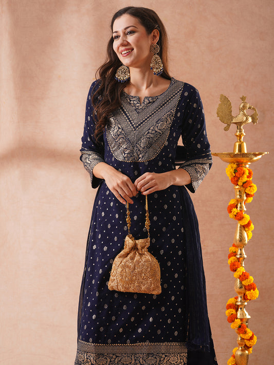 Ethnic Zari Woven Jacquard Straight Kurta with...