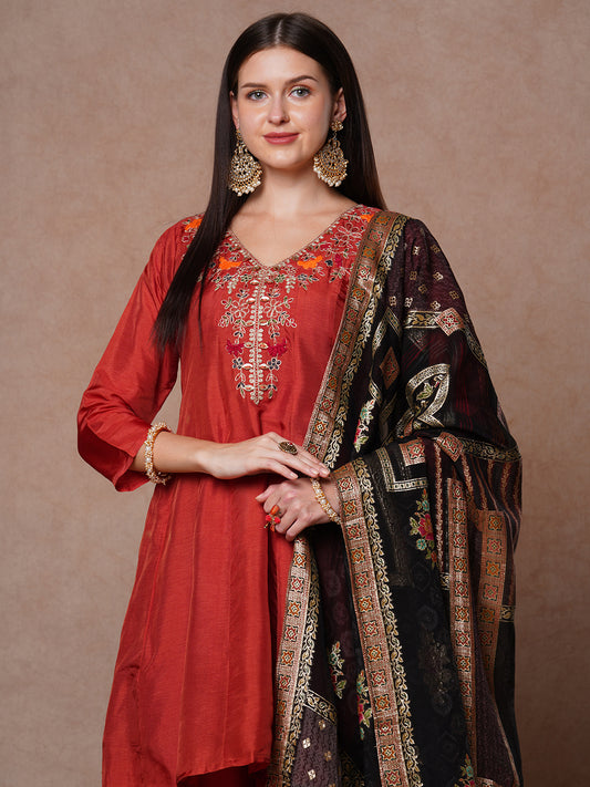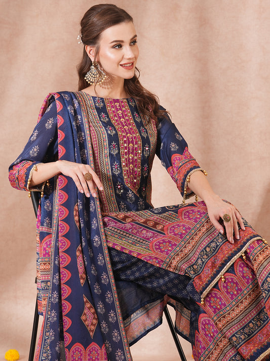 Ethnic Floral Printed & Embroidered Straight Fit...
