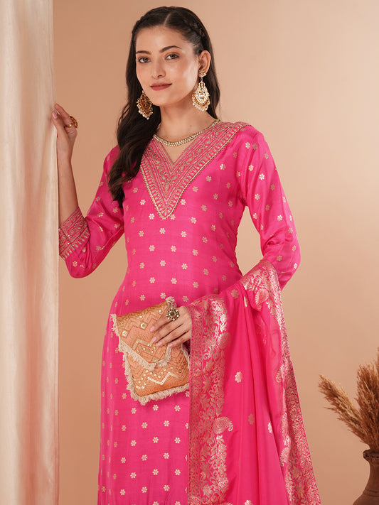 Ethnic Embroidered Jacquard Straight Kurta with Palazzo...