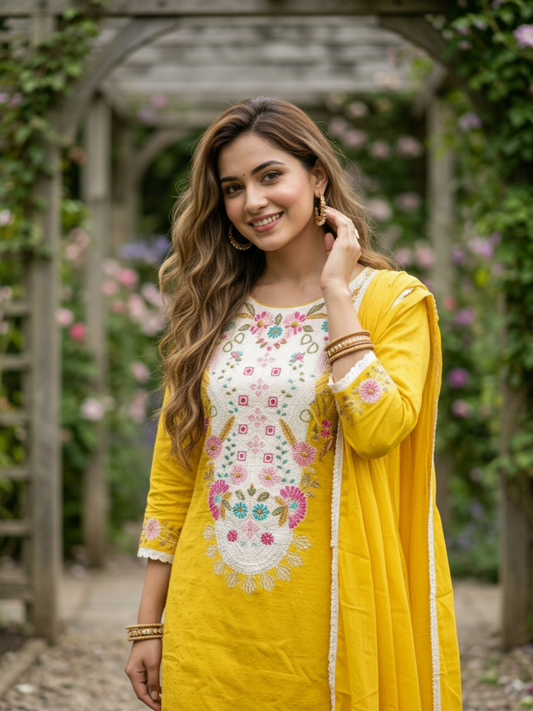 MRP (Inclusive of all taxes)Regular price ₹ 4,449.00₹ 4,449.00 Regular priceUnit price / per₹ 11,199.00Sale priceM L XL 2XL add to cartSale{"id":7816885993558,"title":"Solid Schiffili \u0026 Floral Embroidered Straight Kurta with Palazzo \u0026 Dupatta - Yellow","handle":"solid-schiffili-floral-embroidered-straight-kurta-with-palazzo-dupatta-yellow","description":"\u003ch1\u003e\u003cstrong\u003eHighlights\u003c\/strong\u003e\u003c\/h1\u003e\n\u003cp\u003eA striking three-piece ensemble in radiant yellow, designed to make a refined festive statement. The kurta showcases an intricately embroidered statement yoke, enriched with delicate multi-color floral detailing and schiffili fabric patched beautifully at hem with embroidery that adds depth and artisanal charm. The textured base enhances the richness of the embroidery, while subtle lace accents lend a graceful finish.\u003c\/p\u003e\n\u003cp\u003eThe solid palazzo is thoughtfully elevated with an embroidered border with laces patch at the hem, maintaining balance and sophistication. Completing the look is a soft voile dupatta adorned with embroidered booties and finished with lace edging all around, adding lightness and fluid elegance.\u003c\/p\u003e\n\u003cp\u003eA beautifully crafted set that blends vibrance, finesse, and timeless festive appeal.\u003c\/p\u003e\n\n\u003ch1\u003e\u003cstrong\u003eFabric \u0026amp; Colour\u003c\/strong\u003e\u003c\/h1\u003e\n\u003cul\u003e\n\u003cli\u003eTop Colour: Yellow\u003c\/li\u003e\n\u003cli\u003eTop Fabric: Cotton\u003c\/li\u003e\n\u003cli\u003eBottom Colour: Yellow\u003c\/li\u003e\n\u003cli\u003eBottom Fabric: Pure Cotton\u003c\/li\u003e\n\u003cli\u003eDupatta Colour: Yellow\u003c\/li\u003e\n\u003cli\u003eDupatta Fabric: Voile\u003c\/li\u003e\n\u003c\/ul\u003e\n\n\u003ch1\u003e\u003cstrong\u003eSpecifications\u003c\/strong\u003e\u003c\/h1\u003e\n\u003cul\u003e\n\u003cli\u003eTop Design: Solid\u003c\/li\u003e\n\u003cli\u003eTop Craft: Schiffili, Embroidery, Lace\u003c\/li\u003e\n\u003cli\u003eTop Shape: Straight\u003c\/li\u003e\n\u003cli\u003eNeck: Round Neck\u003c\/li\u003e\n\u003cli\u003eSleeve Length: Three-Quarter Sleeves\u003c\/li\u003e\n\u003cli\u003eTop Length: Calf Length\u003c\/li\u003e\n\u003cli\u003eHemline: Straight\u003c\/li\u003e\n\u003cli\u003eSlit: Side Slits\u003c\/li\u003e\n\u003cli\u003eBottom Type: Palazzos\u003c\/li\u003e\n\u003cli\u003eBottom Closure: Slip-On\u003c\/li\u003e\n\u003cli\u003eWaistband: Elasticated\u003c\/li\u003e\n\u003cli\u003eDupatta Pattern: Embroidered, Solid\u003c\/li\u003e\n\u003cli\u003eDupatta Border: Taping\u003c\/li\u003e\n\u003c\/ul\u003e\n\n\u003cp\u003e\u003cstrong\u003eWash Care:\u003c\/strong\u003e Dry Clean\u003c\/p\u003e\n\n\u003ch1\u003e\u003cstrong\u003eLength (in inches)\u003c\/strong\u003e\u003c\/h1\u003e\n\u003cp\u003eKurta – 46, Sleeves – 17\u003cbr\u003eBottom – 38\u003c\/p\u003e\n\n\u003cp\u003eModel's Height: 5'7\". Wearing Size S.\u003c\/p\u003e\n\n\u003ch1\u003e\u003cstrong\u003eProduct Information\u003c\/strong\u003e\u003c\/h1\u003e\n\u003cp\u003eManufactured\/Packed\/Marketed By:\u003cbr\u003eFashor Lifestyle Pvt. Ltd.\u003cbr\u003e28\/30, Sudarshanpura Industrial Area,\u003cbr\u003eJaipur - 302006.\u003cbr\u003eCountry of Origin: India\u003c\/p\u003e","published_at":"2026-03-10T16:45:11+05:30","created_at":"2026-03-10T14:30:03+05:30","vendor":"FASHOR","type":"3P Kurta Set","tags":["2XL","4000 - 5000","above-3000","casualwear","colour_yellow","craft_schiffili","design_solid","Embroidered","fabric_cotton","Festive Wear","Kurta Set","L","M","occasionwear","rakhi-favourites","Schiffili","shape_straight","workwear","XL"],"price":444900,"price_min":444900,"price_max":444900,"available":true,"price_varies":false,"compare_at_price":1119900,"compare_at_price_min":1119900,"compare_at_price_max":1119900,"compare_at_price_varies":false,"variants":[{"id":44151783325782,"title":"M","option1":"M","option2":null,"option3":null,"sku":"38-ST034733B6FS","requires_shipping":true,"taxable":true,"featured_image":{"id":36443513225302,"product_id":7816885993558,"position":1,"created_at":"2026-03-10T14:25:20+05:30","updated_at":"2026-03-10T14:25:22+05:30","alt":null,"width":1080,"height":1440,"src":"\/\/fashor.com\/cdn\/shop\/files\/33191_1.jpg?v=1773132922","variant_ids":[44151783325782,44151783358550,44151783391318,44151783424086]},"available":true,"name":"Solid Schiffili \u0026 Floral Embroidered Straight Kurta with Palazzo \u0026 Dupatta - Yellow - M","public_title":"M","options":["M"],"price":444900,"weight":0,"compare_at_price":1119900,"inventory_quantity":3,"inventory_management":"shopify","inventory_policy":"deny","barcode":"","featured_media":{"alt":null,"id":28464966926422,"position":1,"preview_image":{"aspect_ratio":0.75,"height":1440,"width":1080,"src":"\/\/fashor.com\/cdn\/shop\/files\/33191_1.jpg?v=1773132922"}},"requires_selling_plan":false,"selling_plan_allocations":[]},{"id":44151783358550,"title":"L","option1":"L","option2":null,"option3":null,"sku":"40-ST034733B6FS","requires_shipping":true,"taxable":true,"featured_image":{"id":36443513225302,"product_id":7816885993558,"position":1,"created_at":"2026-03-10T14:25:20+05:30","updated_at":"2026-03-10T14:25:22+05:30","alt":null,"width":1080,"height":1440,"src":"\/\/fashor.com\/cdn\/shop\/files\/33191_1.jpg?v=1773132922","variant_ids":[44151783325782,44151783358550,44151783391318,44151783424086]},"available":true,"name":"Solid Schiffili \u0026 Floral Embroidered Straight Kurta with Palazzo \u0026 Dupatta - Yellow - L","public_title":"L","options":["L"],"price":444900,"weight":0,"compare_at_price":1119900,"inventory_quantity":1,"inventory_management":"shopify","inventory_policy":"deny","barcode":"","featured_media":{"alt":null,"id":28464966926422,"position":1,"preview_image":{"aspect_ratio":0.75,"height":1440,"width":1080,"src":"\/\/fashor.com\/cdn\/shop\/files\/33191_1.jpg?v=1773132922"}},"requires_selling_plan":false,"selling_plan_allocations":[]},{"id":44151783391318,"title":"